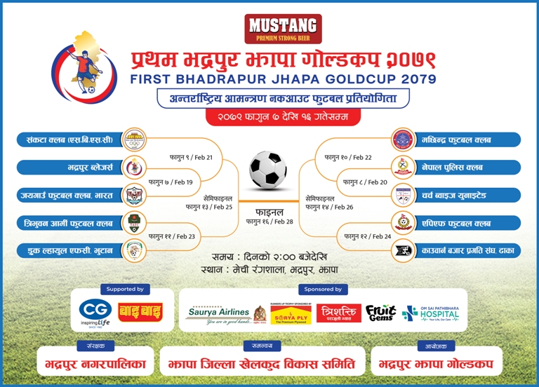प्रथम मुस्ताङ भद्रपुर झापा गोल्ड कप २०७९ को खेलको उद्घाटन खेल भद्रपुर ब्लेजर्स र भारतको जयगाँउ फुटबल क्लबबीच हुने तय भएको छ । प्रतियोगिता मेची रंगशालामा आइतबार (फागुन ७ गते) सुरु हुनेछ ।