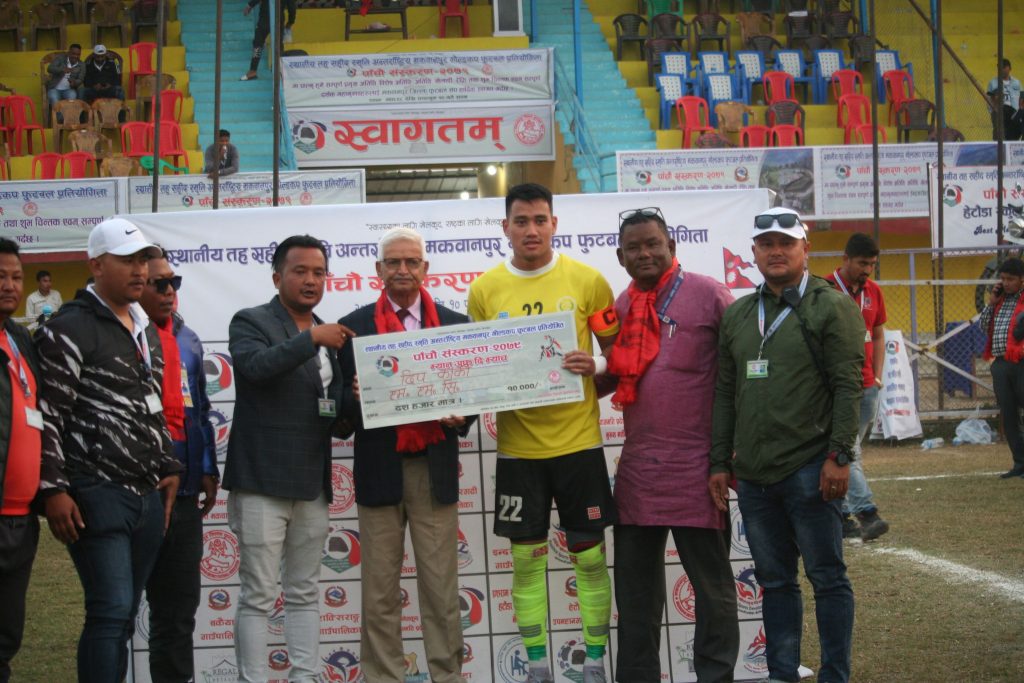 मनाङका कप्तान समेत रहेका गोलकिपर दीप म्यान अफ दी म्याच घोषित भए र उनले १० हजार रुपैयाँ प्राप्त गरे । जिल्ला फुटबल संघ मकवानपुरले आयोजना गरेको प्रतियोगिताको दोस्रो सेमिफाइनल सोमबार हुनेछ । गोल्डकपको विजेताले १५ लाख र दोस्रो हुने टोलीले १० लाख रुपैयाँ प्राप्त गर्नेछ । प्रतियोगिताको सर्वोत्कृष्ट खेलाडीले बुलेट बाइक पाउनेछन् ।