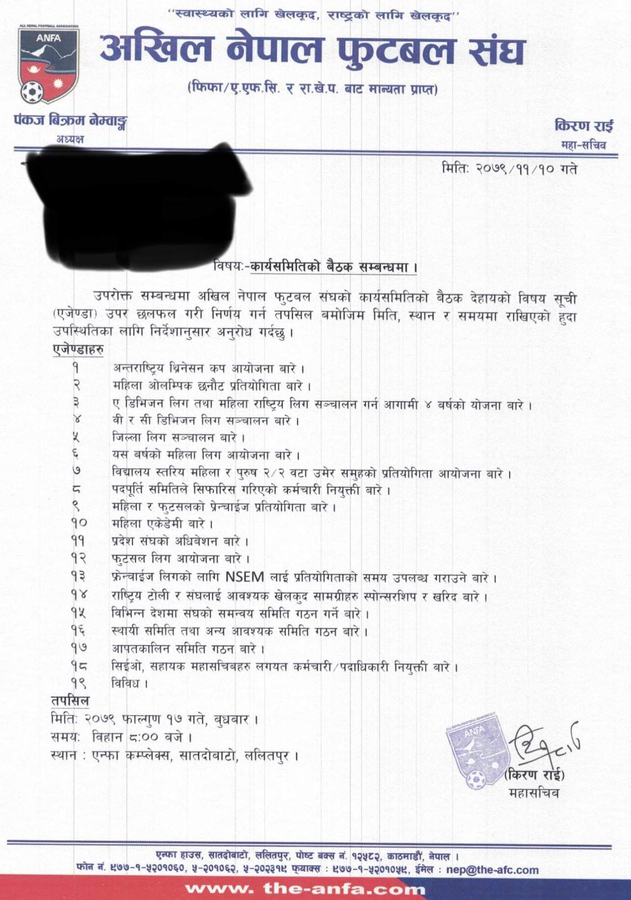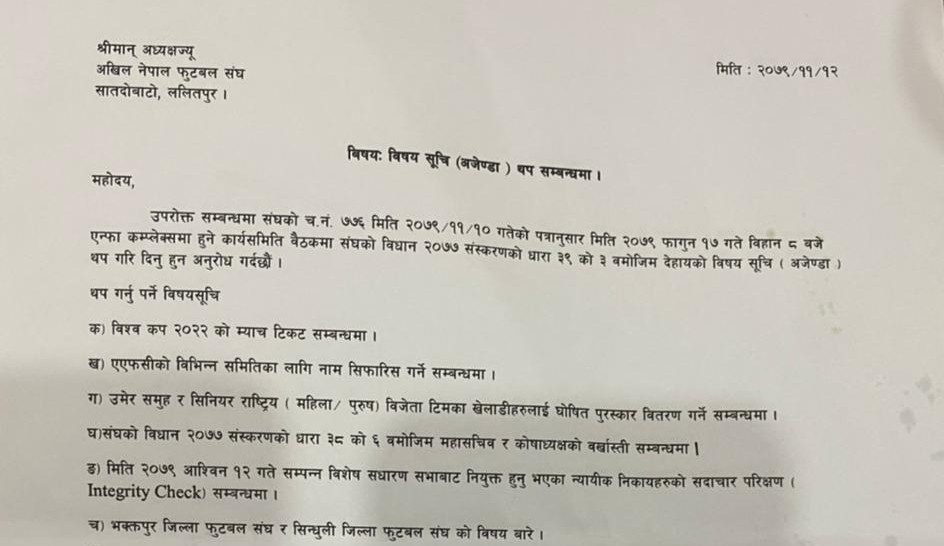 एन्फाले फाल्गुन १७ गते बुधबार कार्यसमिति बैठक बस्ने भन्दै १९ एजेन्डासहित कार्यसमिति सदस्यहरुलाई बुधबार पत्राचार गरेको थियो । त्यसमा कार्यसमितिका १२ सदस्यले ६ एजेन्डा थप गर्न मागसहित पत्र लेखेका हुन् ।