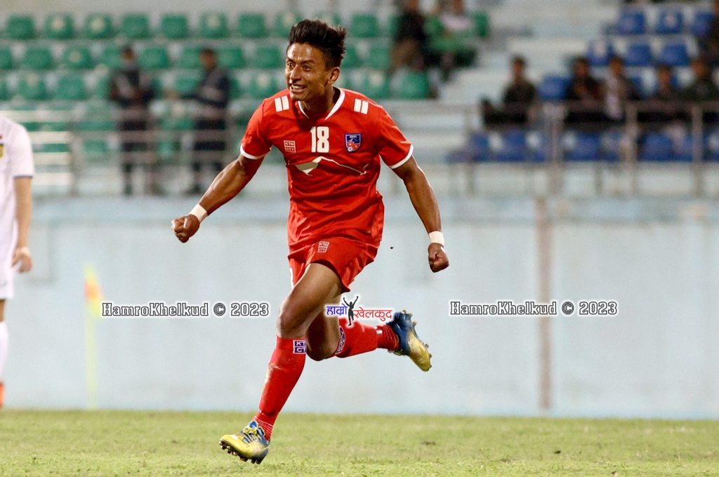 प्रधानमन्त्री थ्री नेसन्स कप अन्तर्गत बुधबार दशरथ रंगशालामा लाओसविरुद्ध नवयुगले दोस्रो हाफमा दर्शनीय गोल गरेका थिए । उनले लाओसको हाफको मध्यभागमा बललाई नियन्त्रणमा लिने प्रयासमा भलीमार्फत सुन्दर गोल गरेका थिए । यो उनको आठौं अन्तर्राष्ट्रिय गोल हो ।
