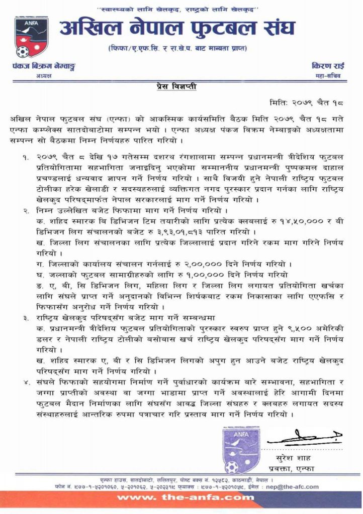 एन्फाको जिल्ला कार्यालय सन्चालनका लागि २ लाख रुपैयाँ दिने, जिल्लाको फुटबल सामाग्रीहरुको लागि १ लाख रुपैयाँ दिने निर्णय एन्फाले गरेको छ । ए, बी, सि डिभिजन लिग, महिला लिग र जिल्ला लिग लगायत प्रतियोगिता खर्चका लागि एन्फाले प्राप्त गर्ने अनुदानको विभिन्न शिर्षकबाट रकम निकासाका लागि फिफा र एएफसीलाई अनुरोध गर्ने एन्फाले अर्को निर्णय गरेको छ ।