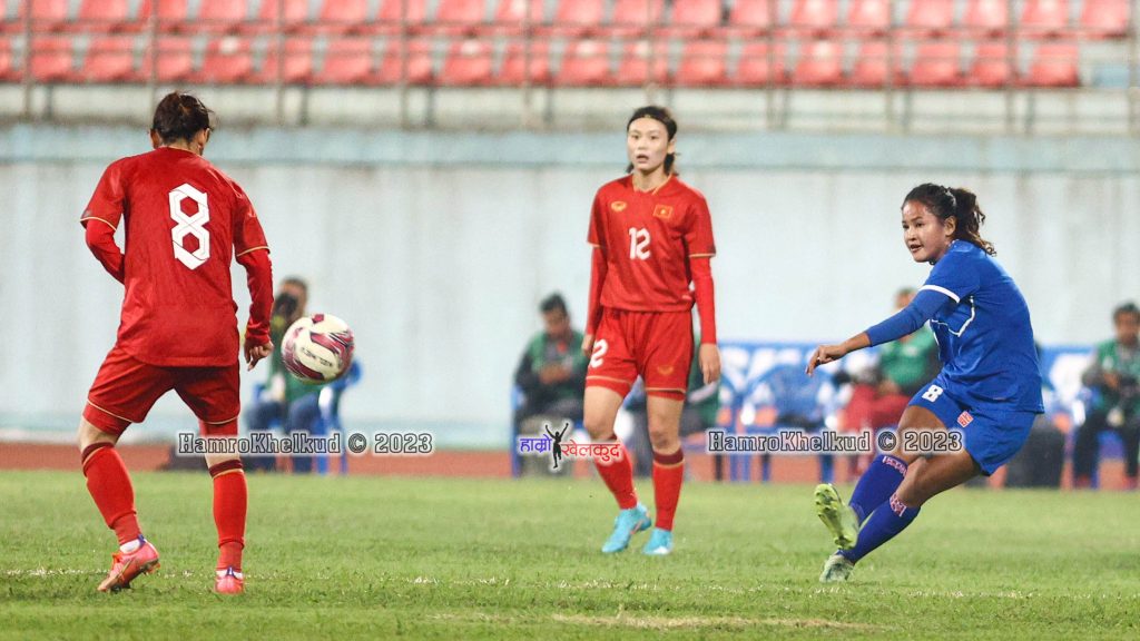 काठमाडौं (हाम्रो खेलकुद) – नेपाली राष्ट्रिय महिला फुटबल टोली पेरिस ओलम्पिक २०२४ को छनोट अन्तर्गत पहिलो हाफमा भियतनामविरुद्ध २-० ले पछि परेको छ । गोलरक्षक एन्जिला तुम्बापो सुब्बाको खराब गोलरक्षणले लगातार दोस्रो खेलमा निरन्तरता पाउँदा नेपाल पछि परेको हो ।