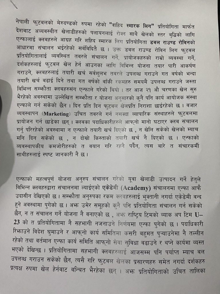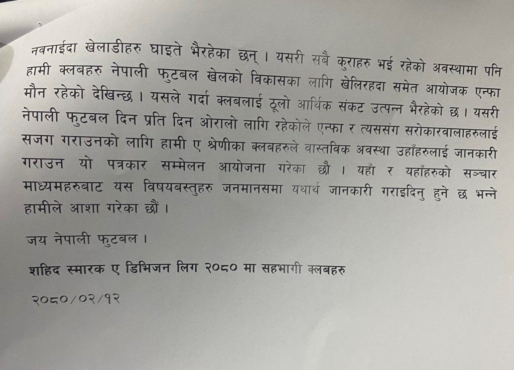 क्लबहरुको संयुक्त विज्ञप्तीमा भनिएको छ, ‘२१ औ चरणका खेल सुरु भैरहेको अवस्थामा उल्लेखित सम्झौता र योजना अनुसारको कुनै पनि कार्य आयोजक संस्था एन्फाले गर्न सकेको छैन । दिन प्रति दिन फुटबल खेलप्रति निराशा छाईरहेको छ । बजार व्यवस्थापन उचित तवरले गर्न नसक्दा व्यापारिक संस्थाहरुले फुटबलमा प्रायोजन गर्न छाडेका छन् ।’
