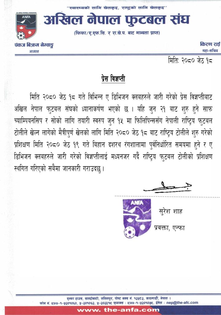 ए डिभिजन क्लबहरुको प्रेस विज्ञप्तीमा एन्फाको ध्यानाकषर्ण भएको जनाउँदै एन्फाले शुक्रबार राष्ट्रिय टोलीको प्रशिक्षण पूर्वनिर्धारित समयमा हुने र त्यसपछि स्थगित गर्ने जनाएको छ । सहिद स्मारक ए डिभिजन लिग चल्दाचल्दै राष्ट्रिय टोलीको प्रशिक्षणका लागि खेलाडी फुकुवा गर्न भनेपछि क्लबहरु एन्फा असन्तुष्ट बनेका थिए ।