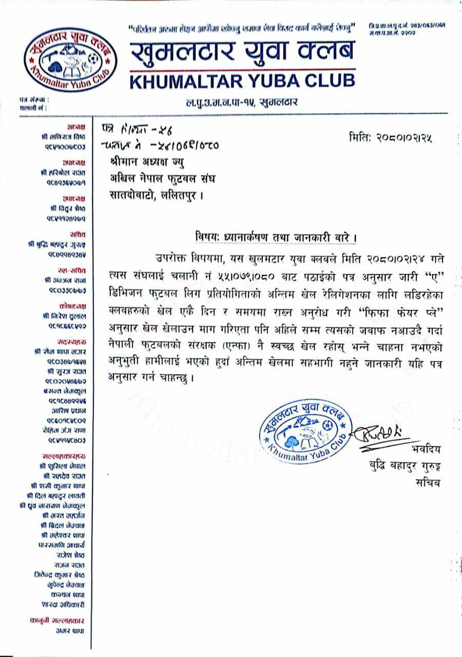 लिगको अन्तिम चरणको खेलमा रेलिगेसन क्षेत्रमा रहेका टोलीका खेलहरु एकसाथ खेलाउन खुमलटारले एन्फालाई आग्रह गरेको थियो । पत्राचार नै गरेर आग्रह गरेकोमा एन्फाले त्यसमा कुनै प्रतिक्रिया नजनाएपछि क्लबले विज्ञप्ति जारी गर्दै खेल नखेल्ने धम्कि समेत दिएको छ । तर क्लबका अध्यक्ष मणिराज विष्टले क्लबले खेल भने खेल्ने बताए ।