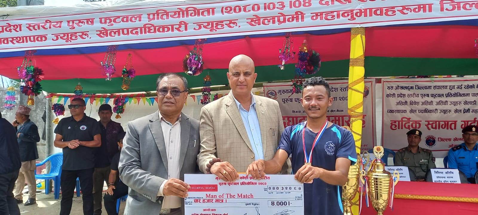 सोलुखुम्बुका लागि खेलको ४९ औं मिनेटमा थिराज राईले सान्त्वाना गोल फर्काएका थिए । खेलको म्यान अफ द म्याच दुई गोल गर्ने ओखलढुंगाका सञ्जय राई भए । उनले ४ हजार रुपैयाँ प्राप्त गरे । उनलाई कार्यक्रमका अध्यक्ष तथा प्रदेश खेलकुद विकास बोर्डका सदस्य सचिव हंशराज वाग्ले र सिद्धिचरण नगरपालिकाका निवर्तमान नगरप्रमुख मोहनकुमार श्रेष्ठले नगद र मेडल प्रदान गरे ।