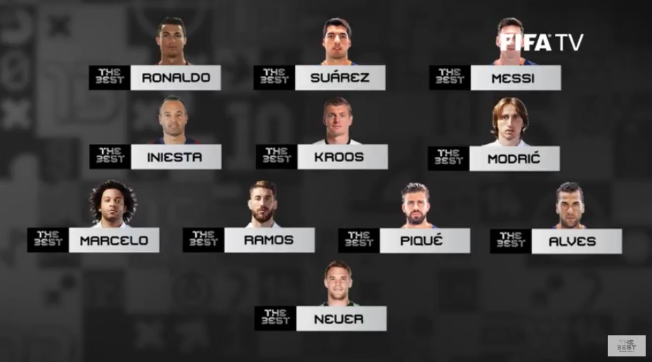 फिफा प्रो वर्ल्ड ११: नेउर; पिके, रामोस, मार्र्सेलो, अल्भेस; मोद्रिच, ईनिएस्टा, क्रुज; मेस्सी, रोनाल्डो, सुअारेज