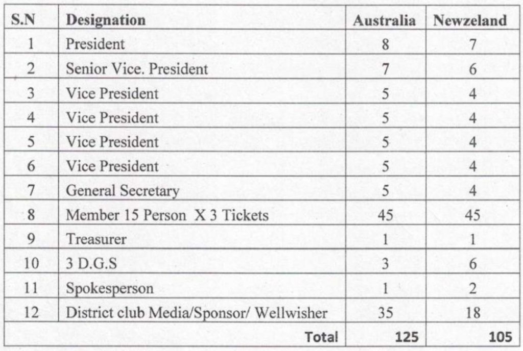 त्यस्तै एन्फा कोषध्यक्षलाई अष्ट्रेलियाको र न्यूजिल्यान्डको समान १, तीन सहायक महासचिव र प्रवक्ता हरेकलाई अष्ट्रेलियाको १ र न्यूजिल्यान्डको २ टिकट तथा एन्फाका सदस्य जिल्ला, क्लब, मिडिया, प्रायोजक र शुभ चिन्तकलाई अष्ट्रेलियाको ३५ र न्यूजिल्यान्डको १८ टिकट भागमा राखिएको थियो ।