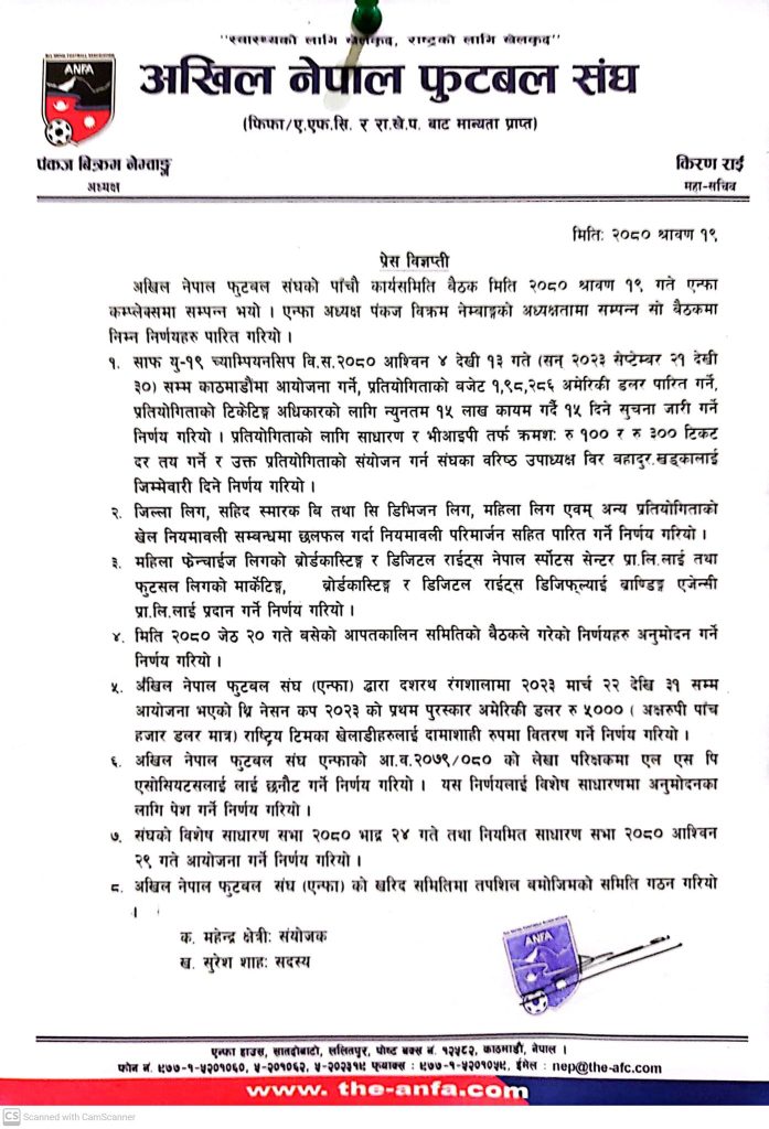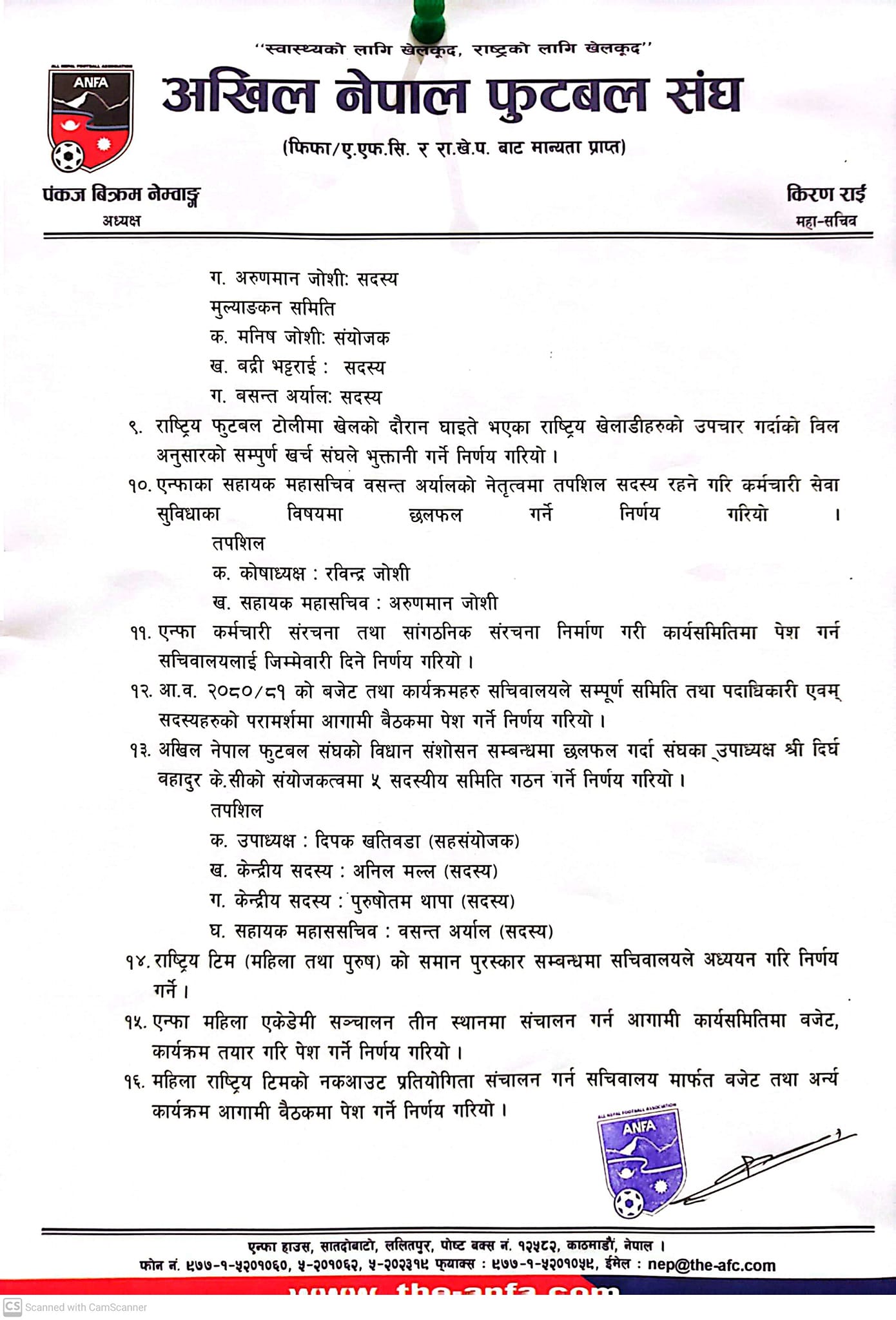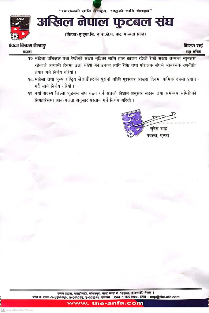बैठकले एन्फाको विभिन्न प्रतियोगिता र समितिमा जिम्मेवारी व्यवस्थापनमा निर्णयहरु लिएको छ । यसबाहेक थ्री नेसन्स कपमा पुरस्कार रहेको ५ हजार अमेरिकी डलर राष्ट्रिय टोलीमा बाँड्ने निर्णय पनि गरेको छ ।