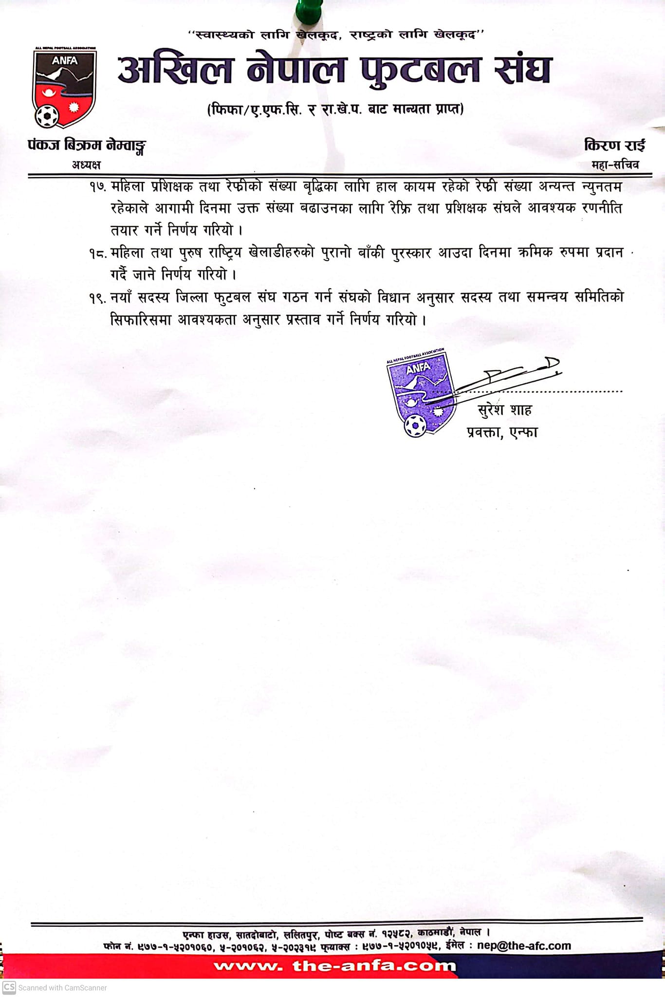 एन्फाले तीन स्थानमा महिला एकेडेमी संचालन गर्न अर्को कार्यसमितिमा बजेट र कार्यक्रम पेश गर्ने निर्णय गरेको छ । त्यस्तै एन्फाले महिला राष्ट्रिय टोलीको नकआउट प्रतियोगिता आयोजना गर्न सचिवालयलाई विस्तृत कार्यक्रम प्रस्तुत गर्न जिम्मा दिएको छ ।