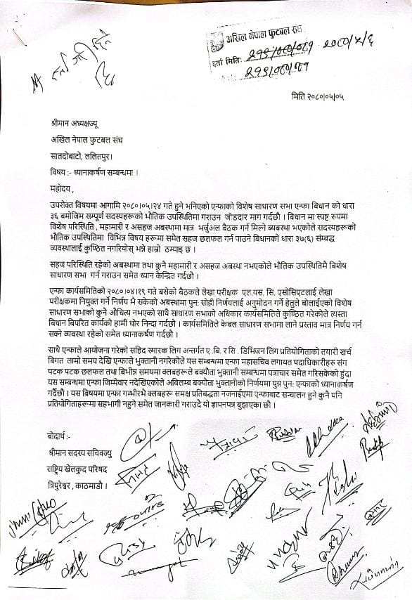 क्लबहरुले भदौ २४ गते हुने भनिएको एन्फाको विशेष साधारण सभा विधान बमोजि सम्पूर्ण सदस्यहरुको भौतिक उपस्थितिमा गराउन माग गरेका छन् । एन्फा बिधान मा स्पष्ट रुपमा विशेष परिस्थिति, महामारी र असहज अबस्थामा मात्र भर्जुअल बैठक गर्न मिल्ने ब्यबस्था छ ।