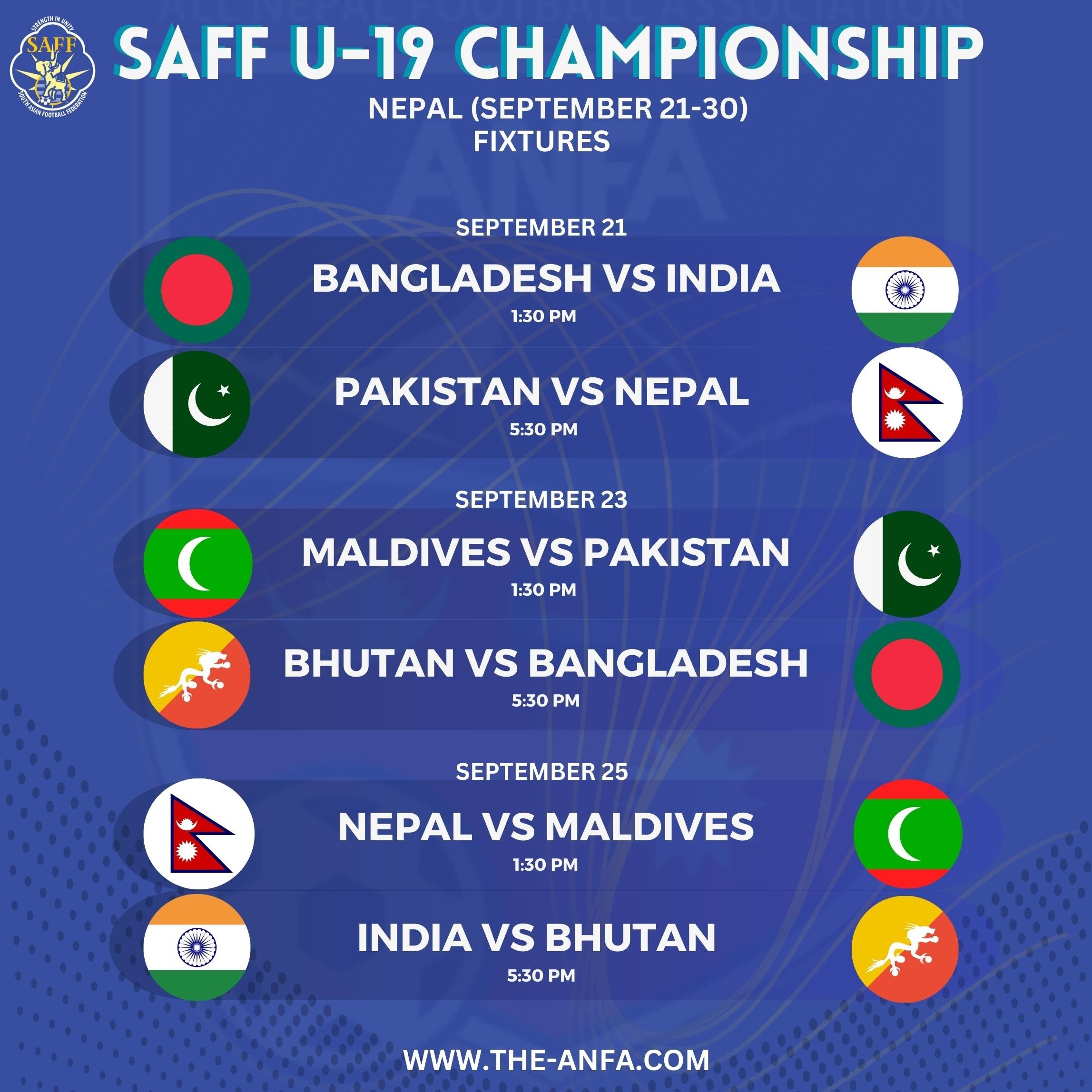 नेपाल रहेको समूहमा पाकिस्तान र माल्दिभ्स छन् । अर्को समूहमा भारत, बंगलादेश र भुटान छन् । नेपालले असोज ४ गते पाकिस्तानसँग, असोज ८ गते माल्दिभ्ससँग प्रतिस्पर्धा गर्नेछ ।