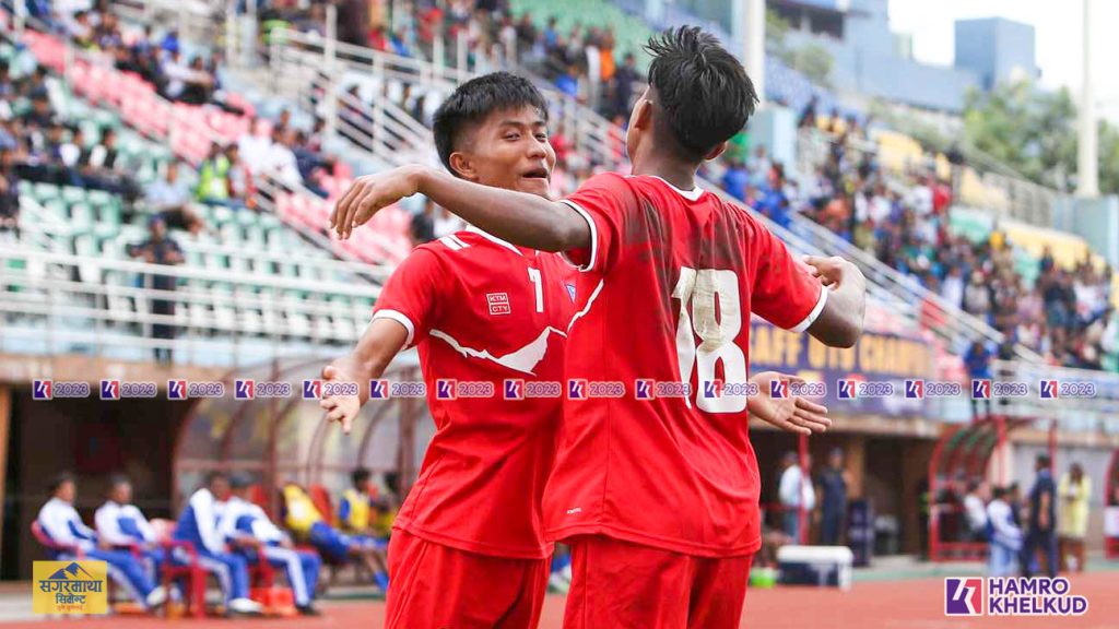 काठमाडौं (हाम्रो खेलकुद) – घरेलु टोली नेपालले साफ यू-१९ च्याम्पियनसिपमा माल्दिभ्समाथि सानदार जित निकाल्दै सेमिफाइनलमा स्थान बनाएको छ । समूह ए को अन्तिम खेलमा नेपालले माल्दिभ्सलाई ४-१ गोल अन्तरले पराजित गर्दै सेमिफाइनलमा स्थान पक्का गरेको छ ।