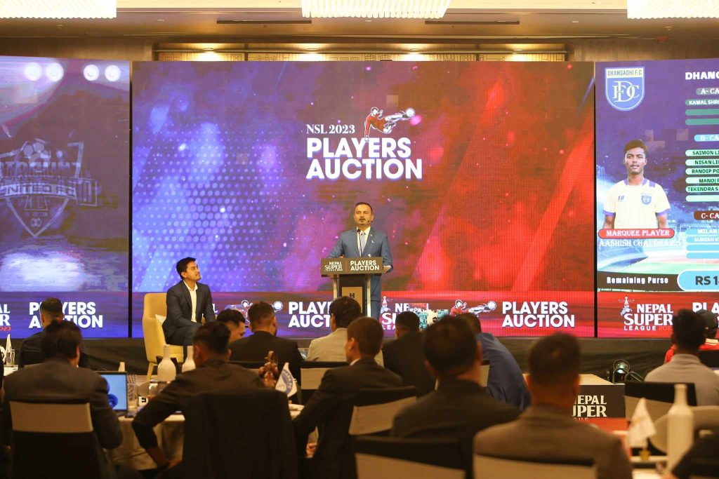 एनएसएलमा काठमाडौं रेजर्स, धनगढी एफसी, एफसी चितवन, पोखरा थन्डर्स, ललितपुर सिटी, बुटवल लुम्बिनी फुटबल क्लब, बिरगंज युनाइेड एफसी, स्पोर्टिङ्ग मेची डे र झापा एफसी छन् । अक्सनमा कुल १ सय ७८ खेलाडी छन् । ए ग्रेडमा २७ खेलाडी छन् । ए ग्रेडका खेलाडीको अक्सन न्यूनतम मूल्य १ लाख ५० हजार छ । ए ग्रेडका खेलाडीको उच्चतम मूल्य ३ लाख ५० हजार रहेको छ ।