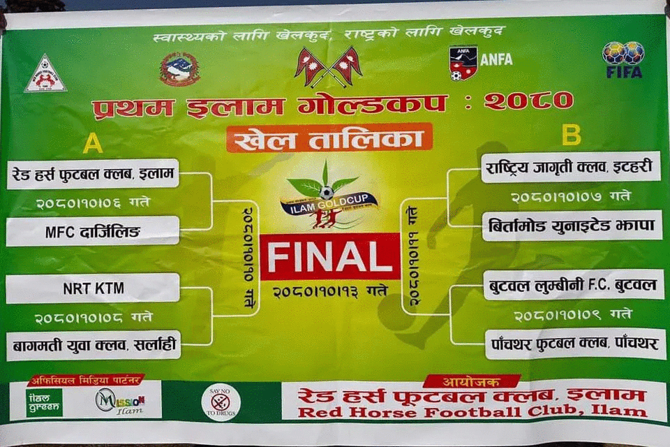प्रथम एनआरएन इलाम गोल्डकप २०८० को उद्घाटन खेल आयोजक रेडहर्स फुटबल क्लब र भारत दार्जिलिङको मानेभञ्ज्याङ फुटबल क्लबबीच हुने भएको छ ।