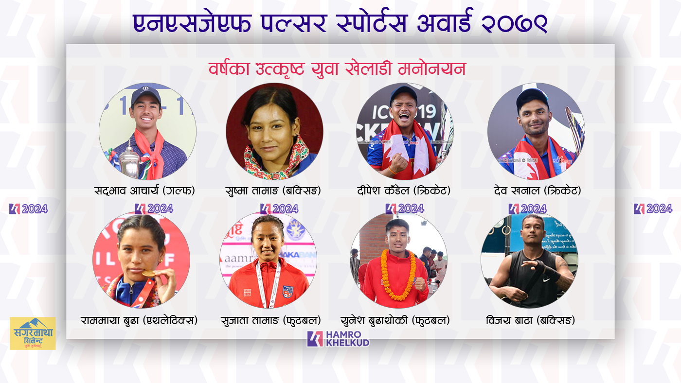 क्रिकेटका यू १९ का कप्तान देव खनाल, दीपेश कँडेल, फुटबलका सुजाता तामाङ र युनेश बुढाथोकी, बक्सिङका सुष्मा तामाङ र विजय बाटासहित एथलेटिक्सकी राममाया बुढा र गल्फका सद्भाव आचार्य मनोनयनयमा परेका छन् ।