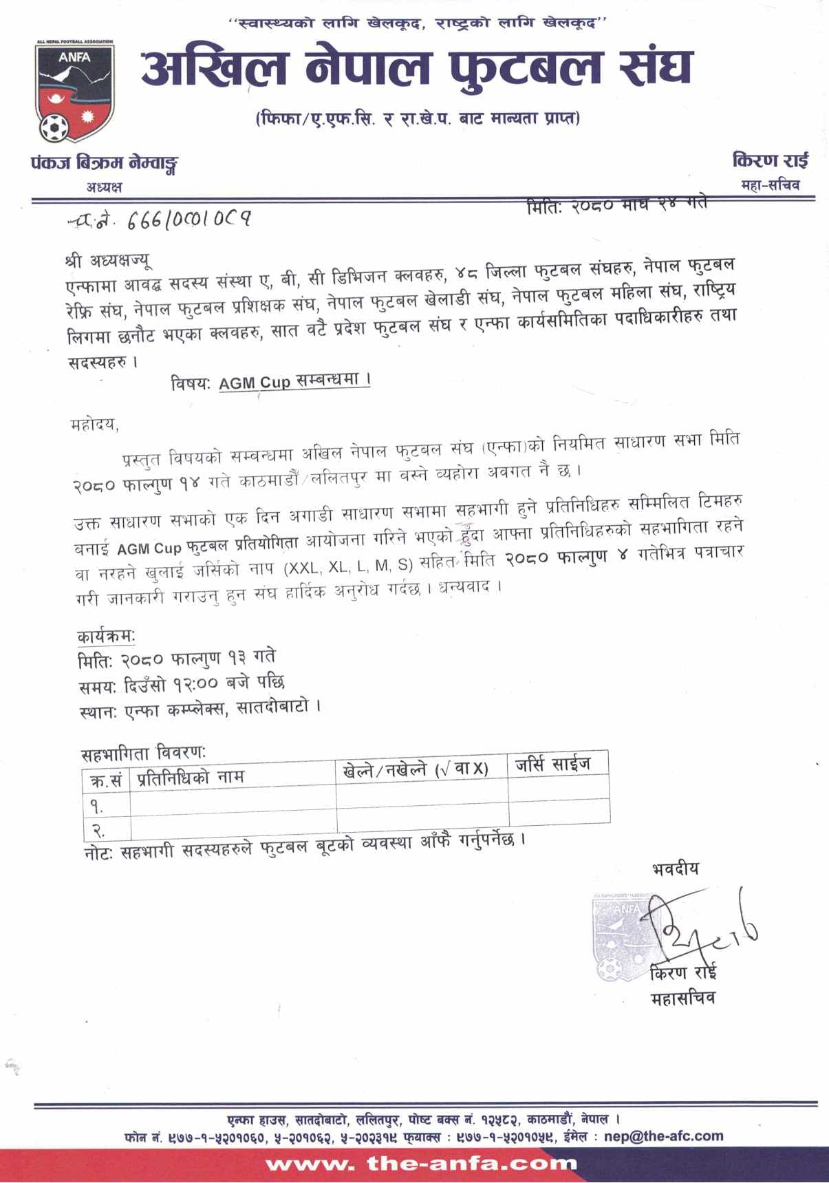 फागुन १४ गते हुने नियमित साधारण सभाको अघिल्लो दिन फागुन १३ गते प्रतिनिधिहरु सम्मलित टिमबीच ‘एजिएम कप’ फुटबल प्रतियोगिता आयोजना गर्ने भएको छ । त्यसका लागि एन्फा महासचिव किरण राईले बुधबार एन्फा आबद्धका ए,बी, सी डिभिजन क्लब, ४८ जिल्ला फुटबल संघ, एन्फाको रेफ्री, प्रशिक्षक, खेलाडी, महिला संघ, राष्ट्रिय लिगका लागि छनोट भएका खेलाडी, सात वटा प्रदेश संघ , एन्फा कार्यसमितिका पदाधिकारी र सदस्यहरुलाई पत्रचार गरेको छन् ।