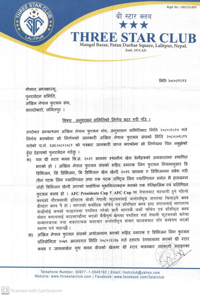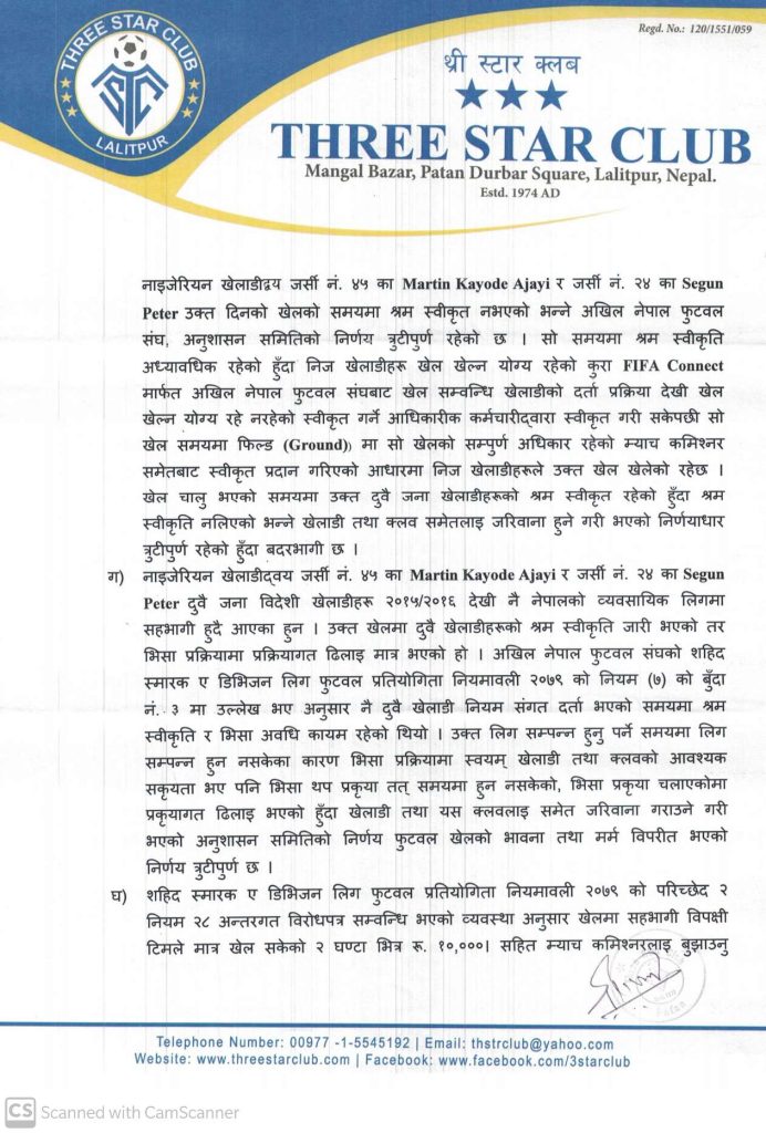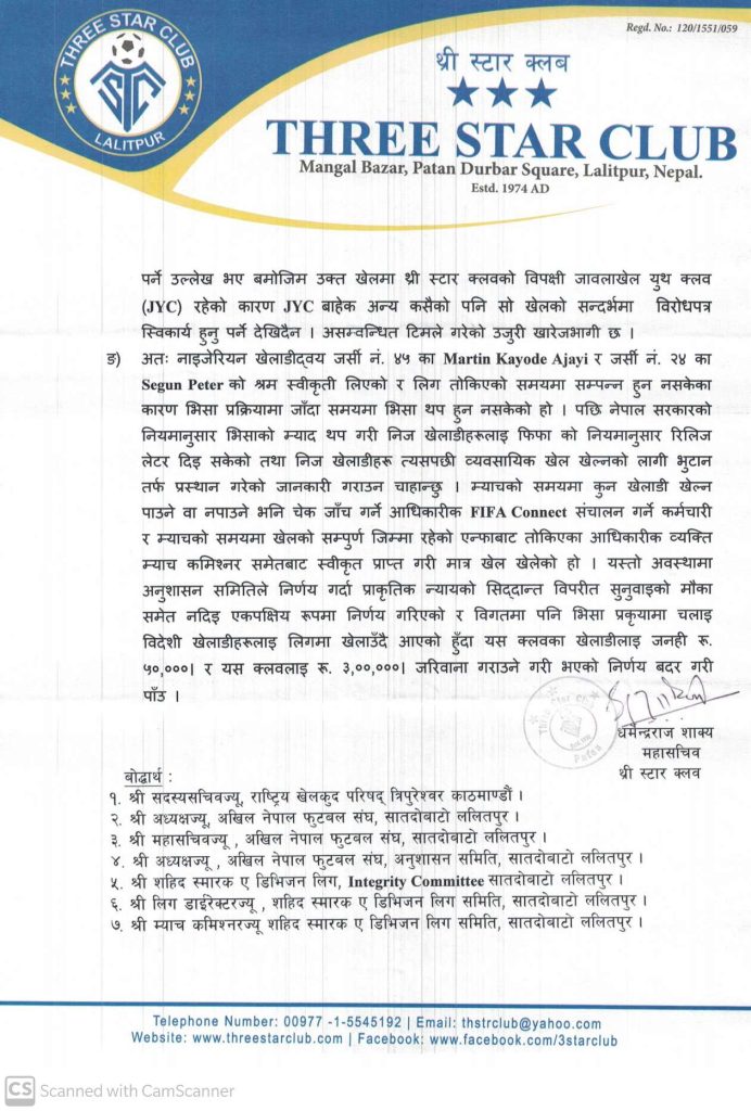 सोही पत्रमा त्यस्तै विना भिसा तथा विना श्रम स्वीकृति खेलाडीहरू सहभागी गराउने थ्री स्टार क्लबले पनि आफ्नो दायित्व पूरा नगरेको पाइएकाले विधान बमोजिजम ३ लाख रुपैयाँ जरिवाना गर्ने निर्णय गरेको जनाइएको छ ।