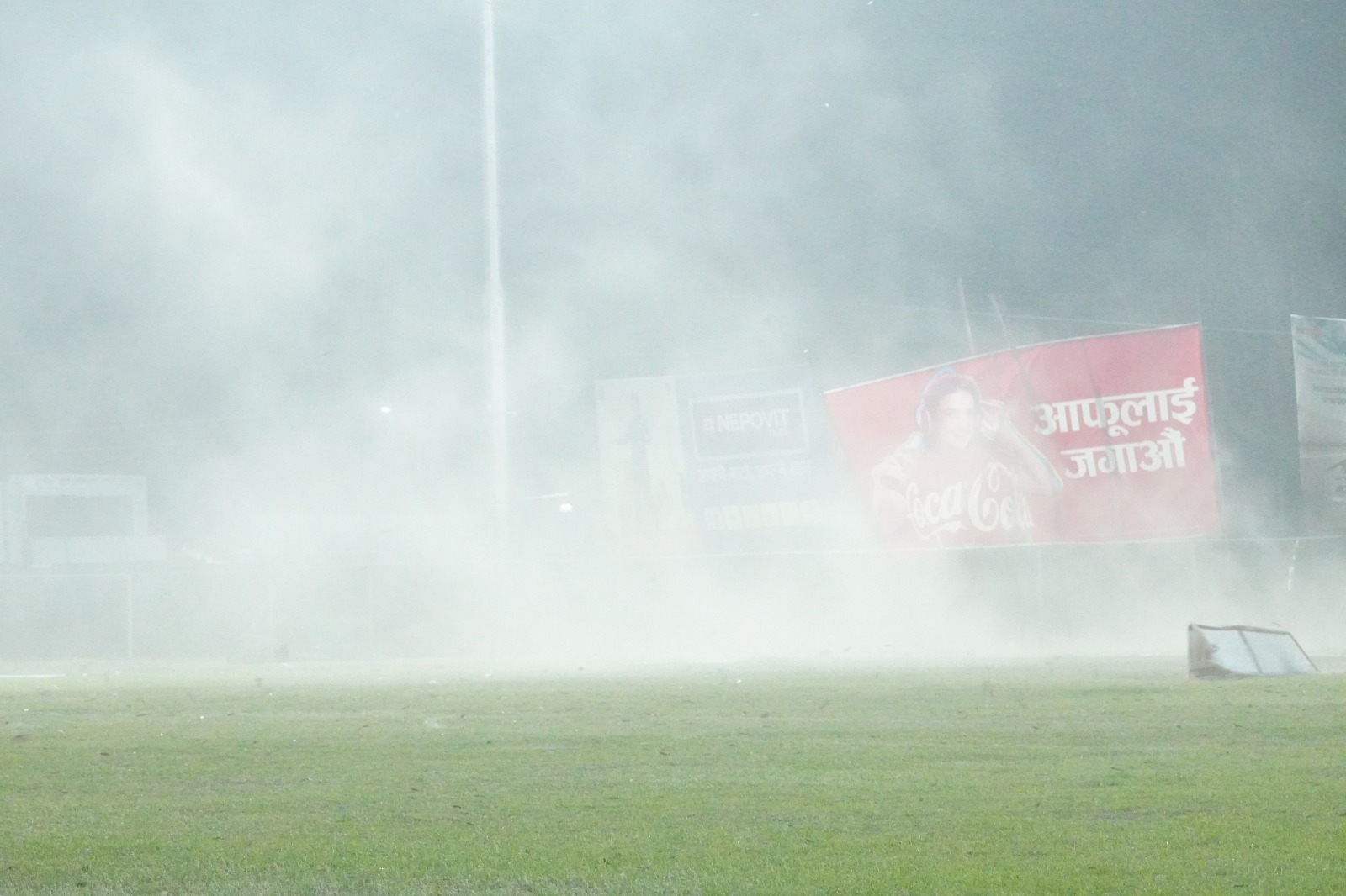 ५८ औं मिनटपछि रेफ्रि उमेश विंडारीले खेल रोक्ने संकेत गरेका थिए । सिमरा रंगशालाको फ्लड लाइटमा खेल चलिरहँदा एक्कासी तिव्र गतिमा हावाहुरी आएको थियो । रंगशालामा राखिएको होडिङ बोर्ड उडेर लाग्दा एकजना दर्शक घाइते समेत भएका छन् ।