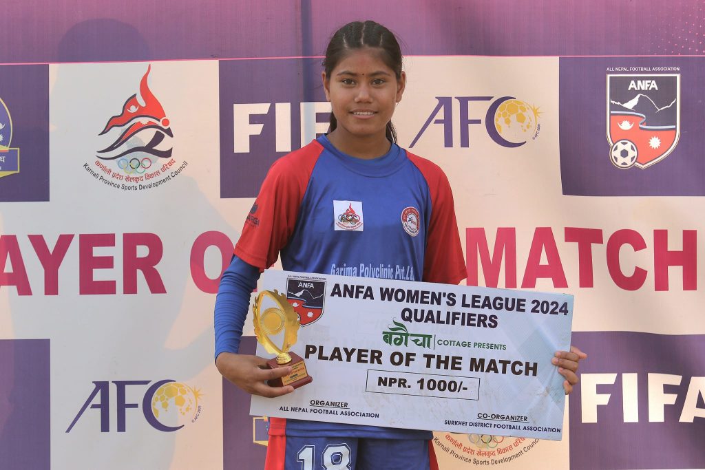 सर्खेतस्थित कर्णाली प्रदेश रंगशालामा सुदूरपश्चिमले आधा दर्जन गोल गर्ने क्रममा यशोदाले २६ औं मिनेटमा गोलको खाता खोलिन् । २९औं मिनेटमा बिर्सना चौधरीले अग्रता दोब्बर पारिन् । ४४औं मिनेटमा यशोदाले व्यक्तिगत दोस्रो गोल गर्दा पहिलो हाफमा सदूरपश्चिमले ३–० को अग्रता बनायो ।