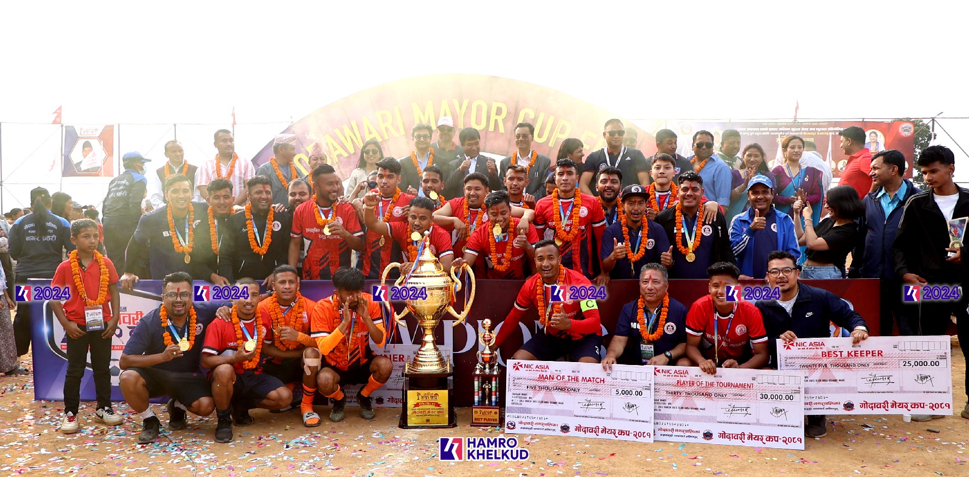 प्रस्तावित गोदावरी बहुउदेश्यीय रंगशालाको झ्यालुन्टार मैदानमा शनिबार भएको फाइनलमा चन्द्रागिरी नगरपालिकालाई २–१ गोल अन्तरले हराउँदै काठमाडौं च्याम्पियन बनेको हो । काठमाडौंका लागि अखिलेष कार्की र दीपेश श्रेष्ठले गोल गरे ।