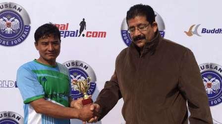 म्यान अफ दी म्याच ट्रफी प्रदान गर्दै नेपाल तरुण दलका अध्यक्ष जितजंग बस्नेत (दायाँ) ।