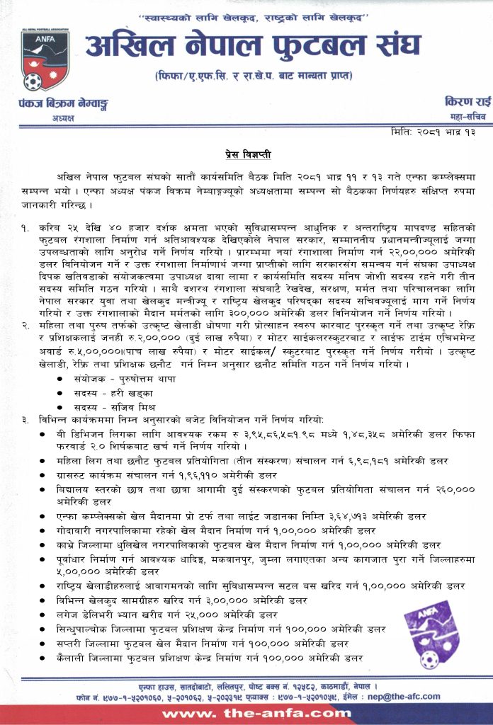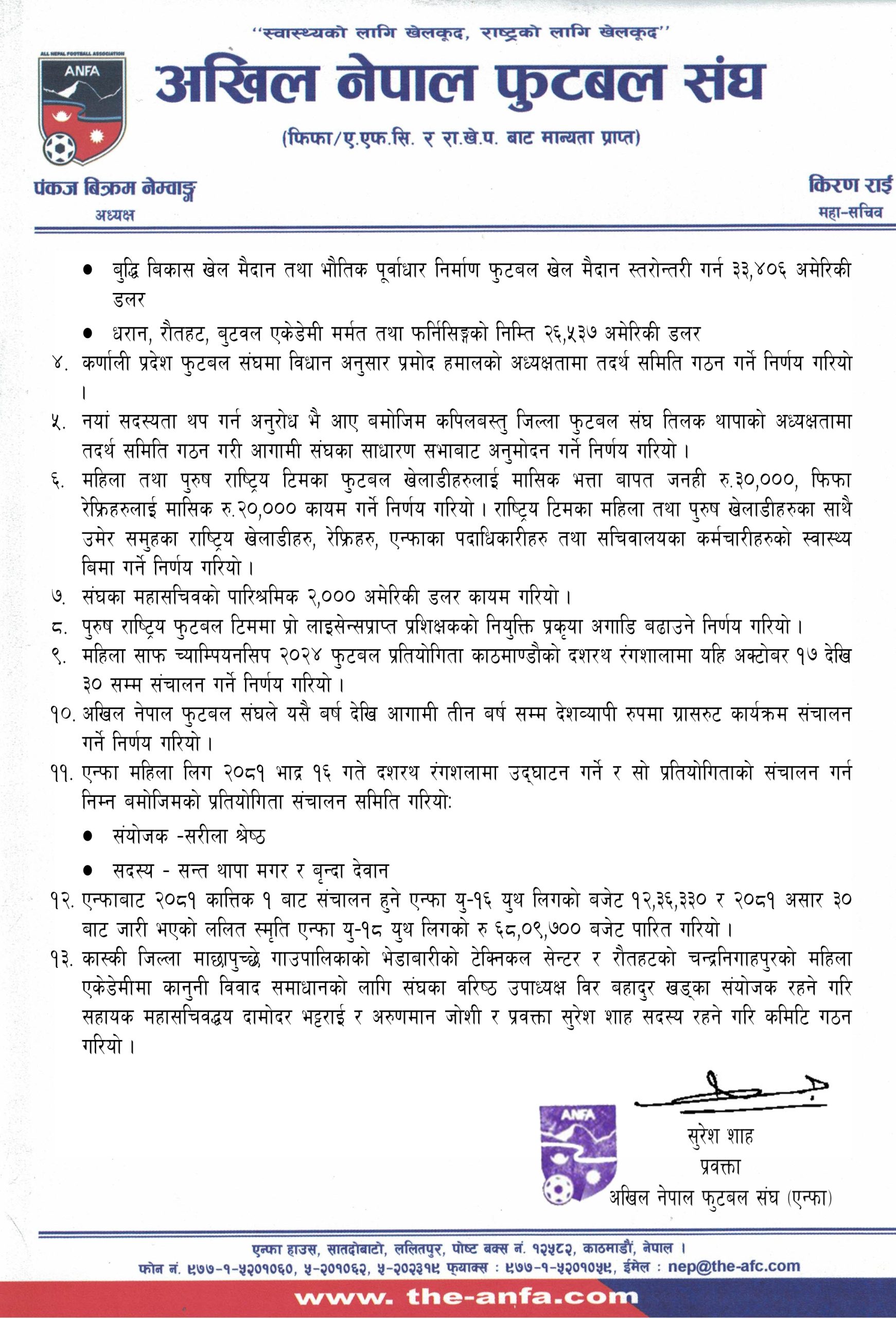 एन्फा बैठकले साफ महिला फुटबल च्याम्पियनसिप काठमाडौंमा आयोजना गर्ने, विभिन्न जिल्लामा मैदान निर्माण गर्नका लागि बजेट विनियोजन गरेको छ । राष्ट्रिय फुटबल टोली महिला र पुरुष टोलीका खेलाडीको मासिक तलब १८ बाट ३० हजार रुपैयाँ पुराउने निर्णय भएको छ ।