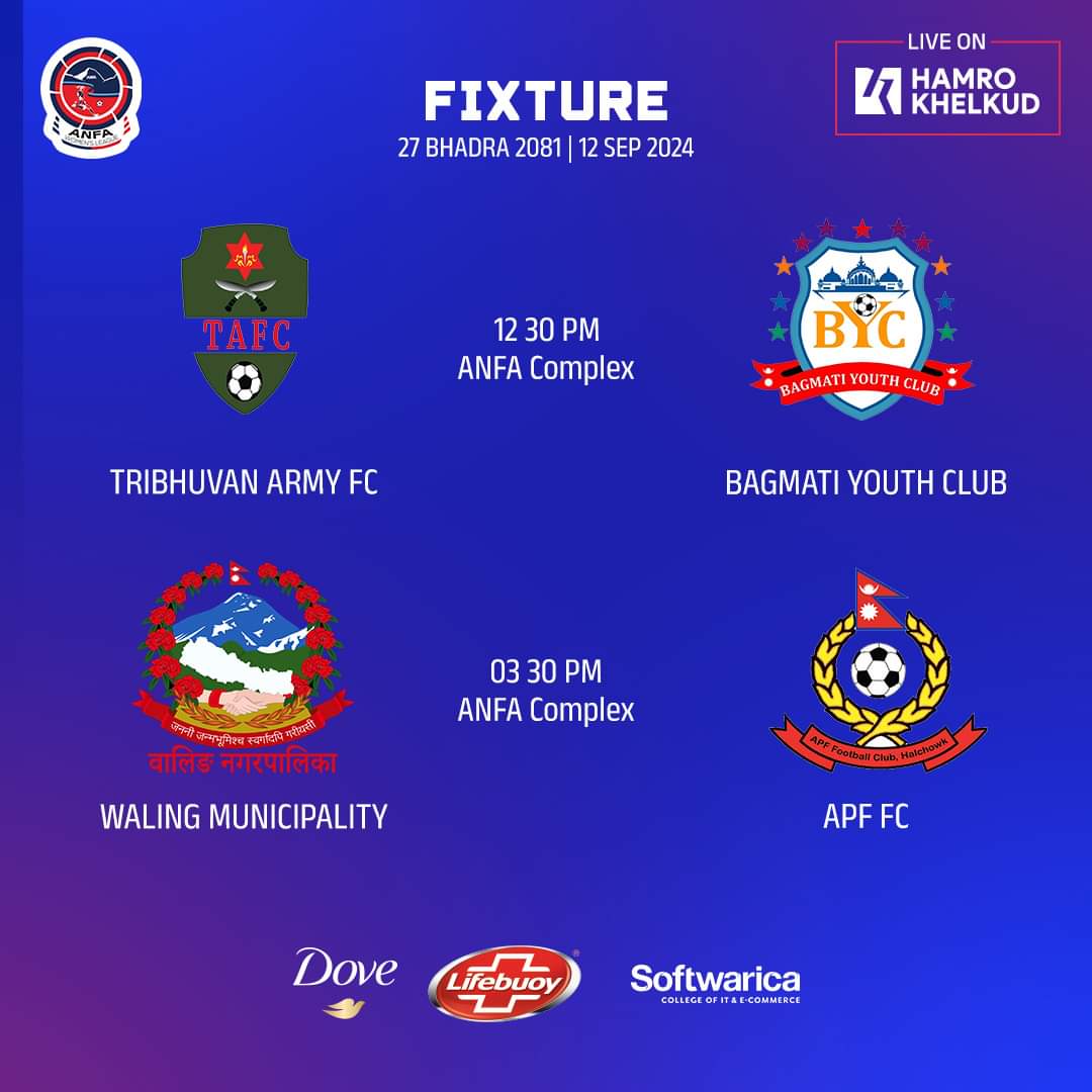 एन्फा कम्प्लेक्स सातदोबाटोमा हुने पहिलो खेलमा बागमती युथ क्लब र विभागीय टोली त्रिभुवन आर्मी फुटबल क्लबबीच प्रतिस्पर्धा हुँदैछ । खेल मध्यान्ह १२ः३० बजे सुरु हुनेछ ।