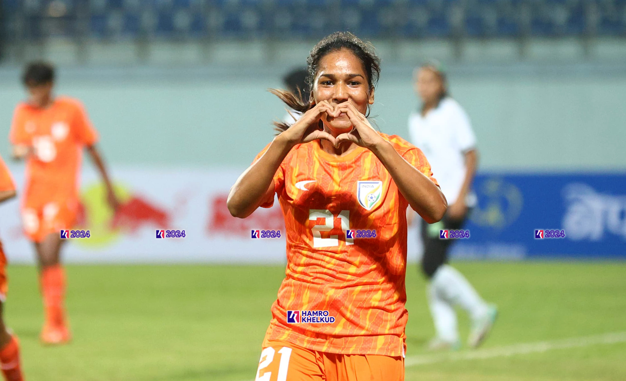 खेलको पाँचौ मिनेटमै भारतले खेलमा अग्रता लियो । ग्रेस दाङमेइले पेनाल्टी क्षेत्र बाहिरबाट गरेको प्रहारमा गोलरक्षक निशा अशरफले बचाउन सकेनन् । बायाँ विंगबाट रन्जना चानुले दिएको क्रसलाई ग्रेसले नियन्त्रणमा लिँदै सहजै प्रहार गरेकी थिइन् ।