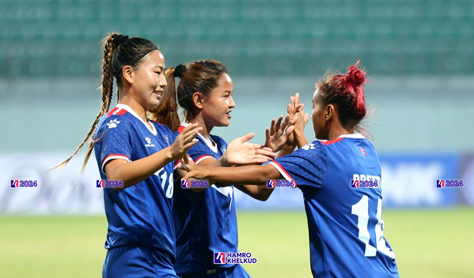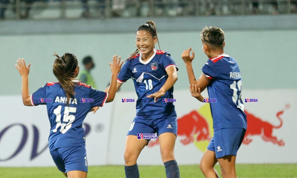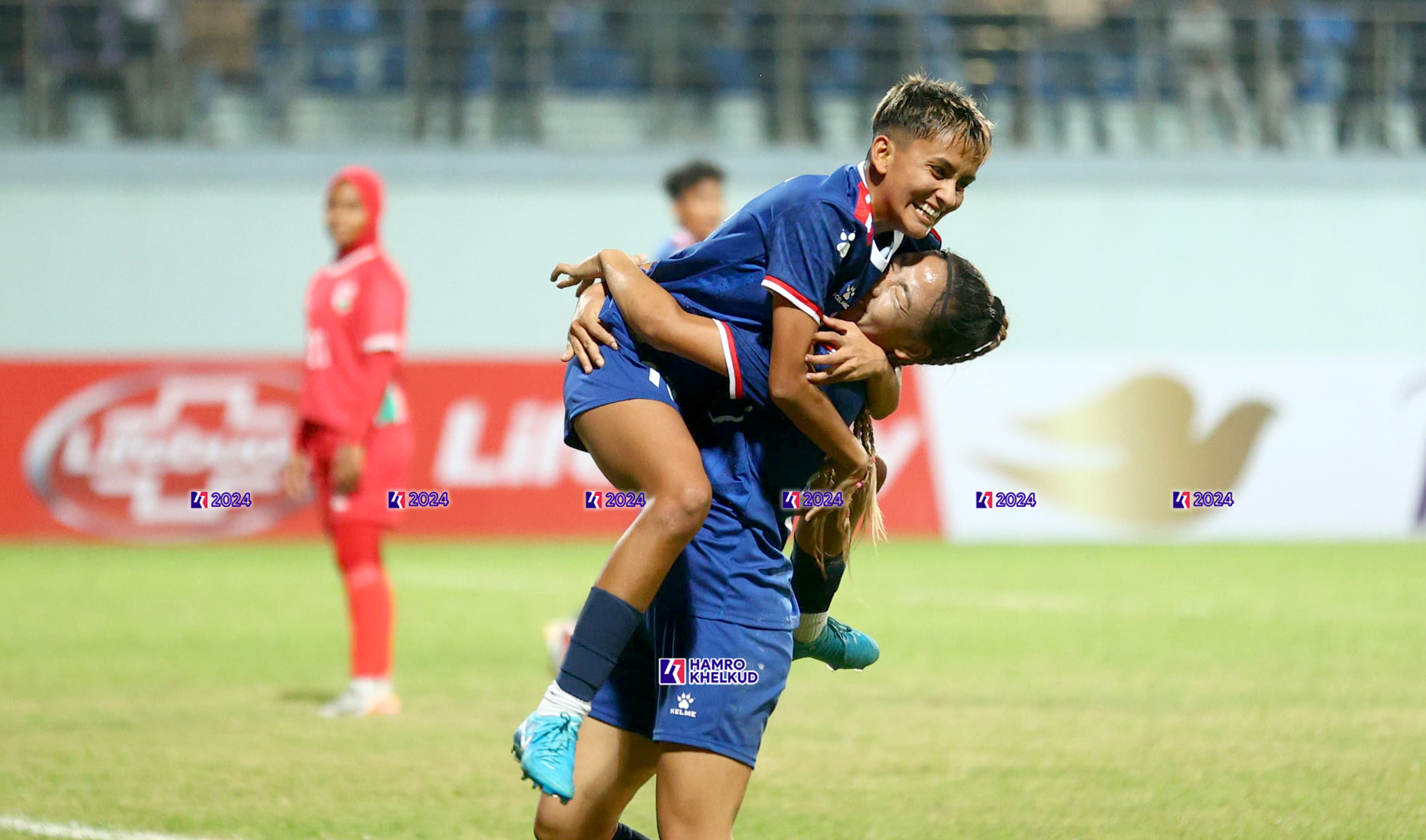 दशरथ रंगशालामा सोमबार सम्पन्न खेलमा माल्दिभ्समाथि ११-० को फराकिलो जितका साथ नेपाल अंक तालिकाको शीर्षस्थानमा पनि उक्लिएको छ । पहिलो हाफमा ४ गोल गरेको नेपालले दोस्रो हाफमा ७ गोल थपेको थियो । नेपालको जितमा रेखा पौडेलले ५ गोल र प्रिती राईले ह्याट्रिक पूरा गर्दा सविता राना मगर, अमिशा कार्की र अनिता केसीले १-१ गोल गरे ।