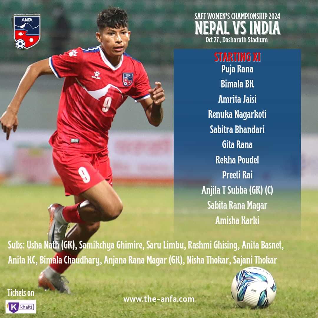 आज भारतसँगको खेलमा कप्तान एंवम् गोलकिपर एन्जिला र रक्षापंक्तिले बलियो चुनौतीको सामना गर्नुपर्ने सम्भावना छ। पहिलो पटक च्याम्पियन बन्ने सम्भावना बढाउनका लागि नेपालले आज साँझ ६:३० बजे सुरु हुने खेलमा भारतलाई हराउनु विकल्प छैन।