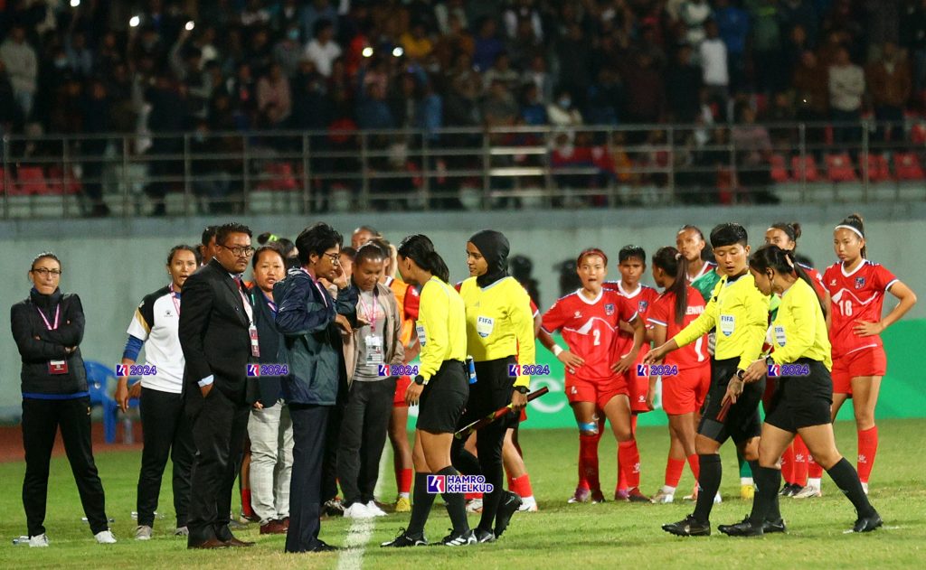 रेफ्रीको निर्णयका कारण भएको विवादले खेल झन्डै १ घण्टा रोकियो । खेल रद्द समेत हुने संघारमा थियो । त्यस्तोमा राष्ट्रिय पुरुष टोलीका कप्तान किरण चेम्जोङ र एन्फा खेलाडी संघका अध्यक्ष विक्रम लामाले बेन्चनजिक गएर घटनाक्रम बुझे । किरण र विक्रमले टोलीका सिनियर खेलाडी साम्बा, कप्तान एन्जिला तुम्बापो सुब्बा र गिता रानालाई खेल खेल्न सल्लाह दिएपछि नेपाली टोली खेल्नका लागि तयार भएको थियो ।