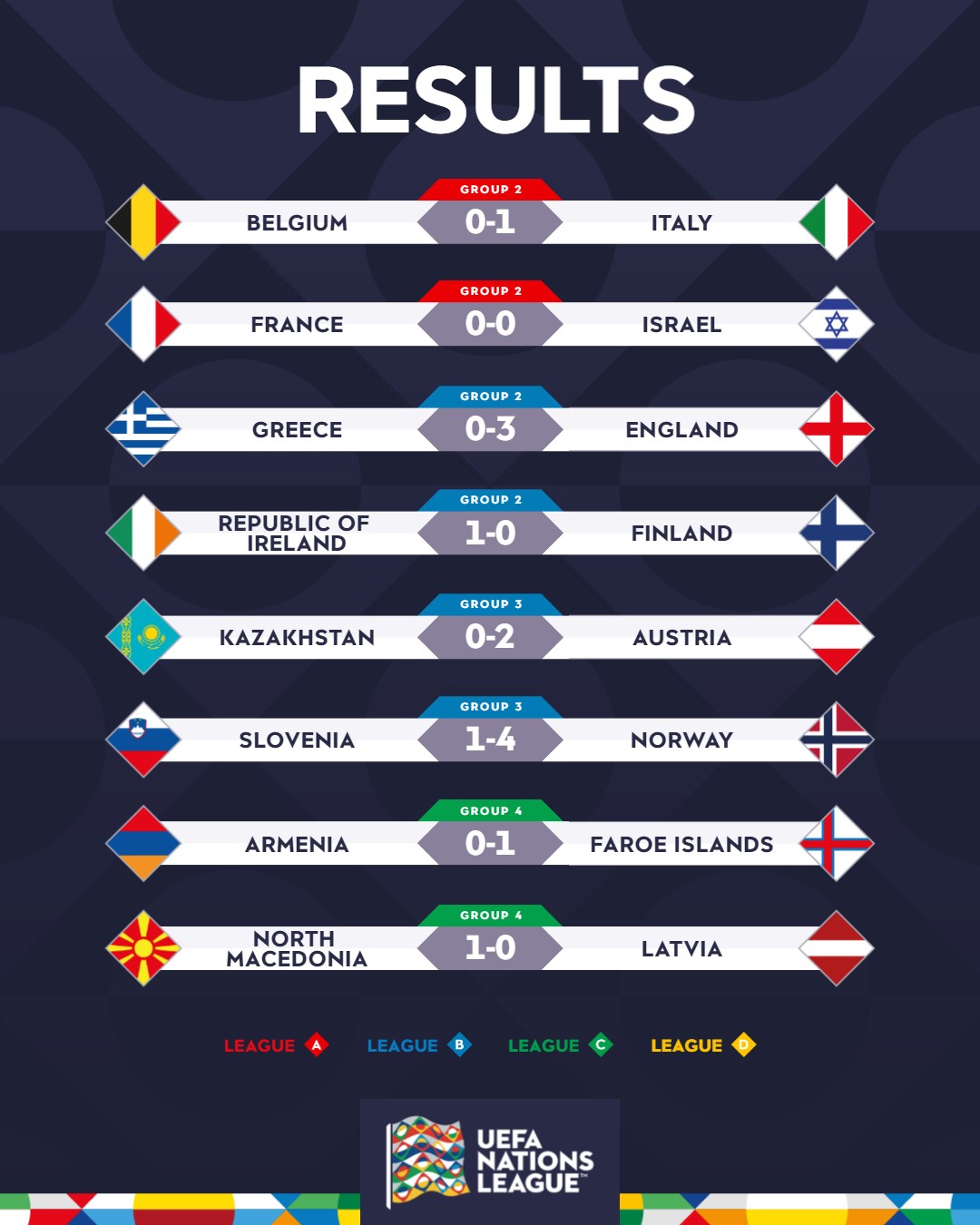 लिग ए समूह २ को शीर्षस्थानमा रहेको इटालीको ५ खेलमा १३ र दोस्रो स्थानको फ्रान्सको १० अंक छ।