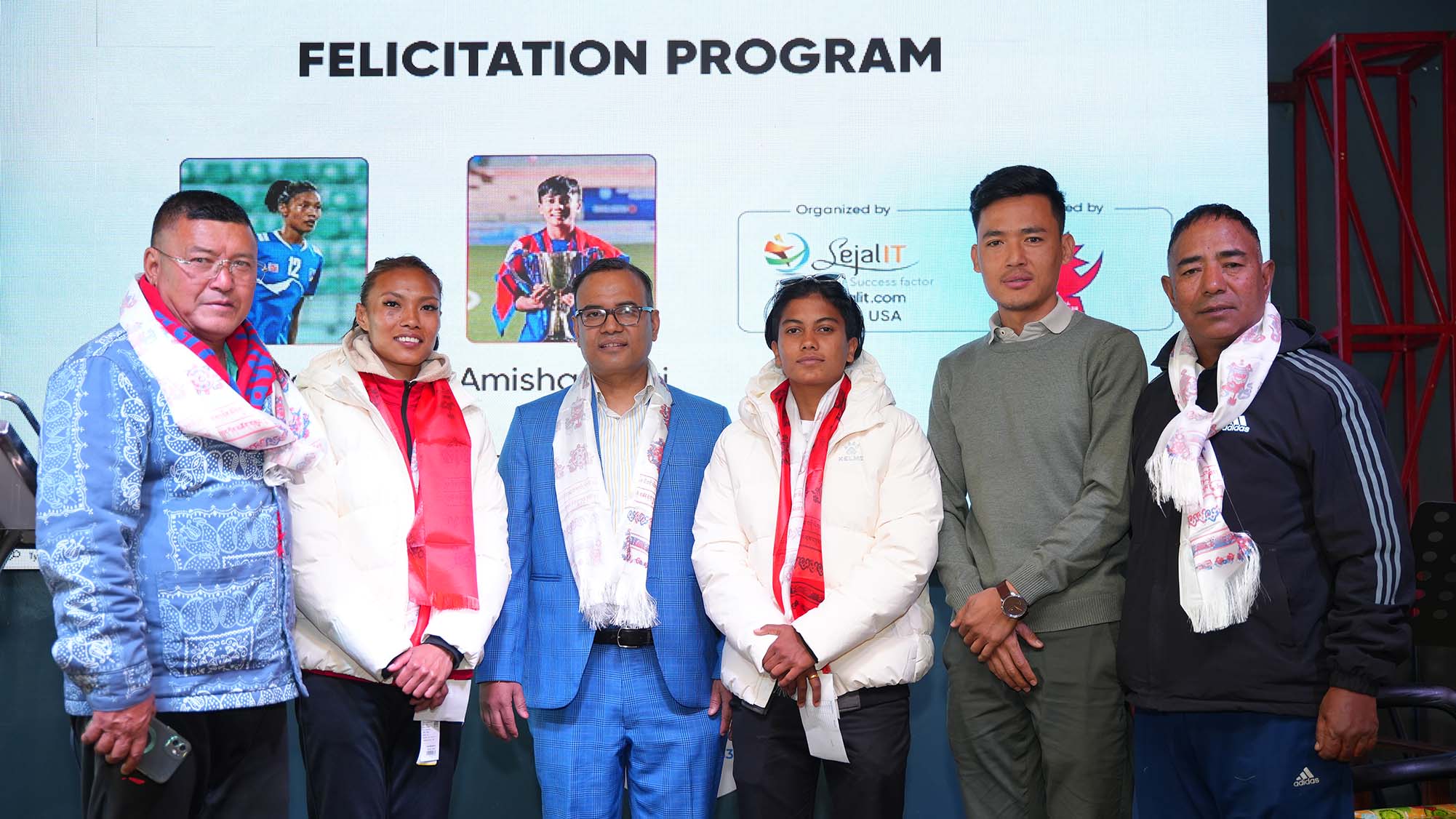 काठमाडौं (हाम्रो खेलकुद)- नेपाल फुटबल खेलाडी संघको संयोजकमा नेपाली राष्ट्रिय महिला टोलीका स्ट्राइकर अमिशा कार्की र डिफेन्डर गीता राणालाई नगद सहित सम्मानित भएका छन्।