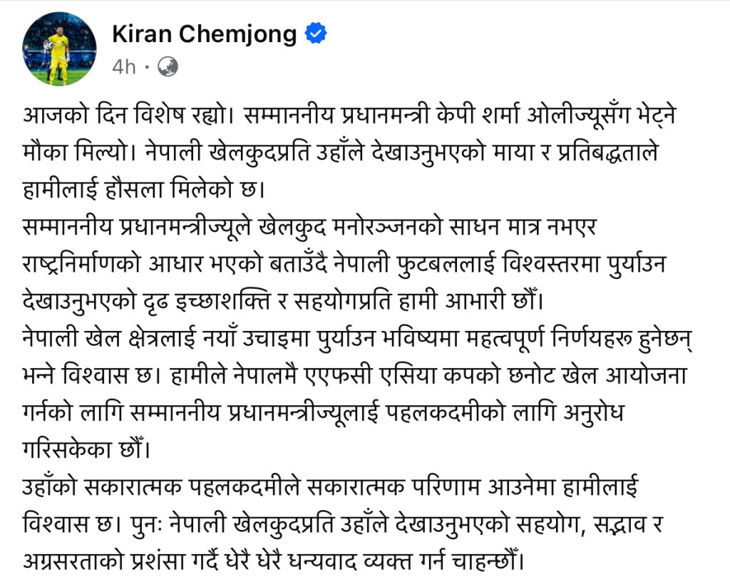 प्रधानमन्त्री ओलीले खेलकुद मनोरञ्जनको साधन मात्र नभएर राष्ट्रनिर्माणको आधार भएको बताउँदै नेपाली फुटबललाई विश्वस्तरमा पुर्याउन दृढ इच्छाशक्ति देखाएको किरणले जनाएका छन् ।