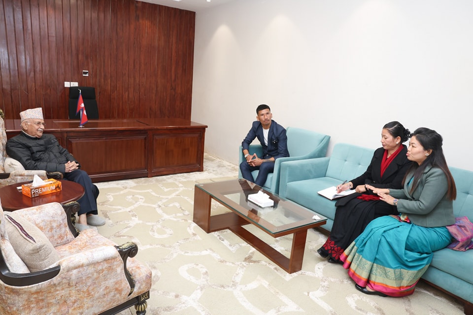 काठमाडौं (हाम्रो खेलकुद) – राष्ट्रिय पुरुष फुटबल टोलीका कप्तान किरण चेम्जोङले सोमवार प्रधानमन्त्री केपी शर्मा ओलीसँग भेटेका छन् ।