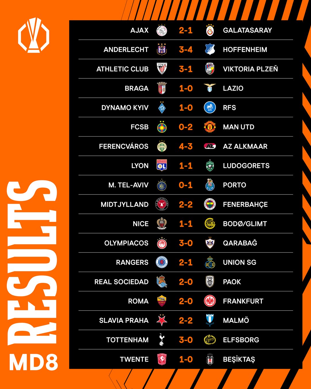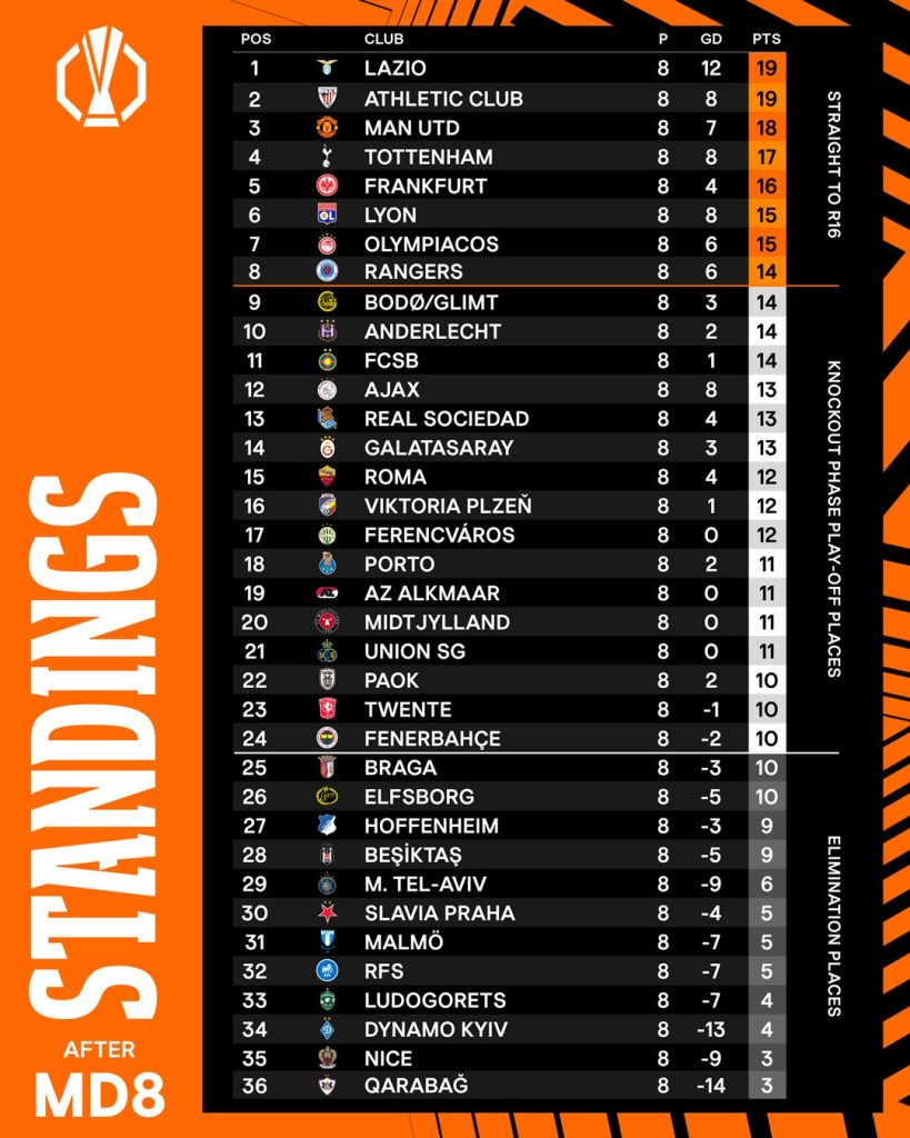 लाजियो ब्रागासँग १-० ले पराजित भएपनि १९ अंकसहित तालिकाको शीर्ष स्थानमा रहन सफल भयो । युरोपियन क्लब फुटबलमा च्याम्पियन्स लिग पछि दोस्रो ठूलो प्रतियोगिताको लिग चरण समाप्तिमा समान १९ अंकसहित एथलेटिको बिलबाओ दोस्रो स्थानमा रह्यो।