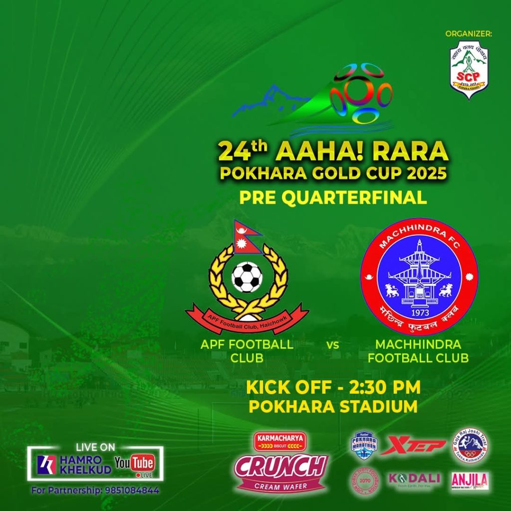 पोखरा (हाम्रो खेलकुद)- आहा! रारा पोखरा गोल्डकप फुटबल प्रतियोगिताको दोस्रो दिन आज पूर्व विजेता एपिएफ फुटबल क्लबले मच्छिन्द्र फुटबल क्लबको सामना गर्दैछ ।