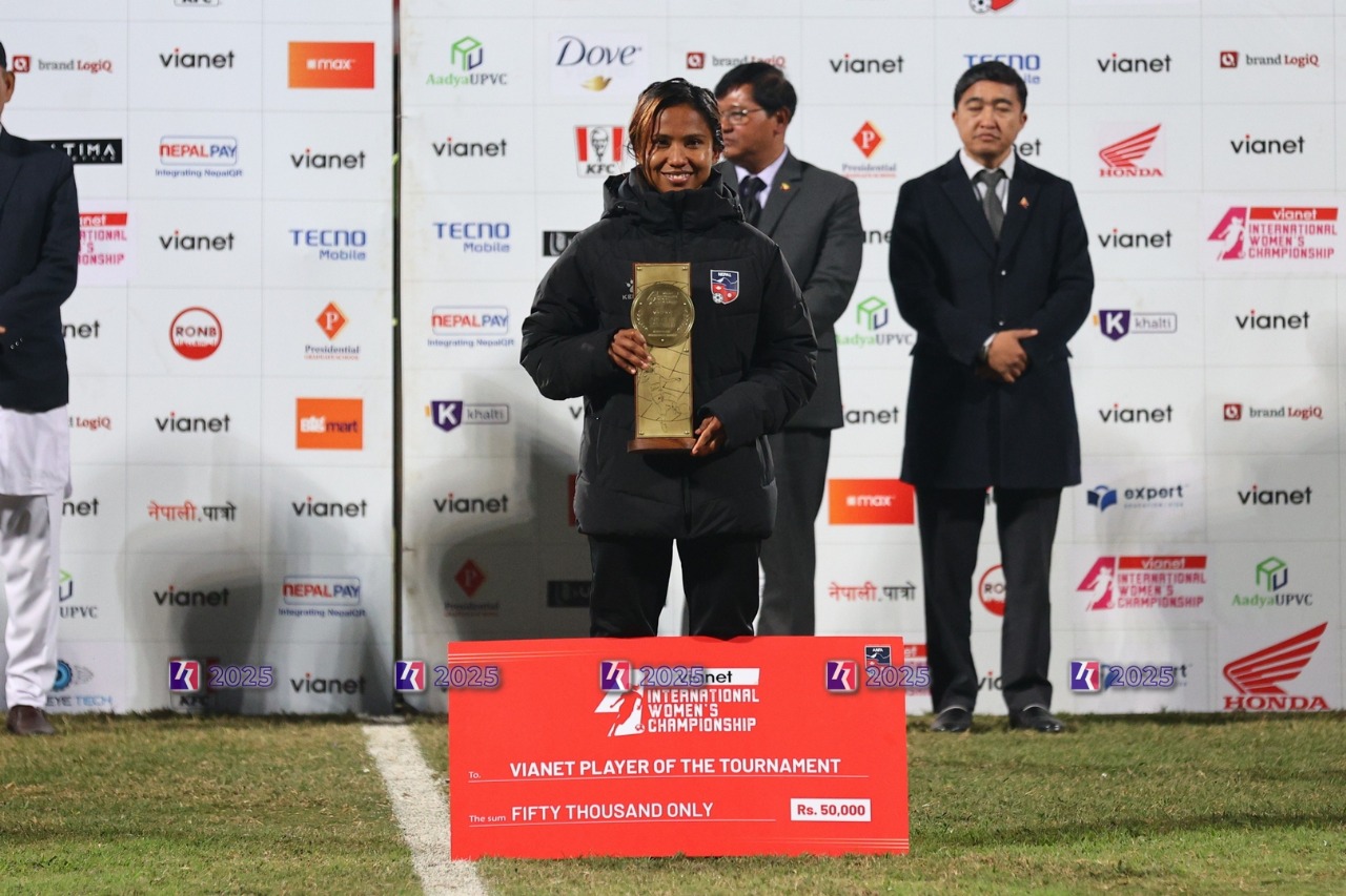 काठमाडौं (हाम्रो खेलकुद)- नेपाली राष्ट्रिय महिला फुटबल टोलीकी पूर्व कप्तान रेनुका नगरकोटे फोर नेसन्स इन्टरनेसनल उमन्स च्याम्पियनसिपको सर्वोत्कृष्ट खेलाडी घोषित भएकी छिन्।