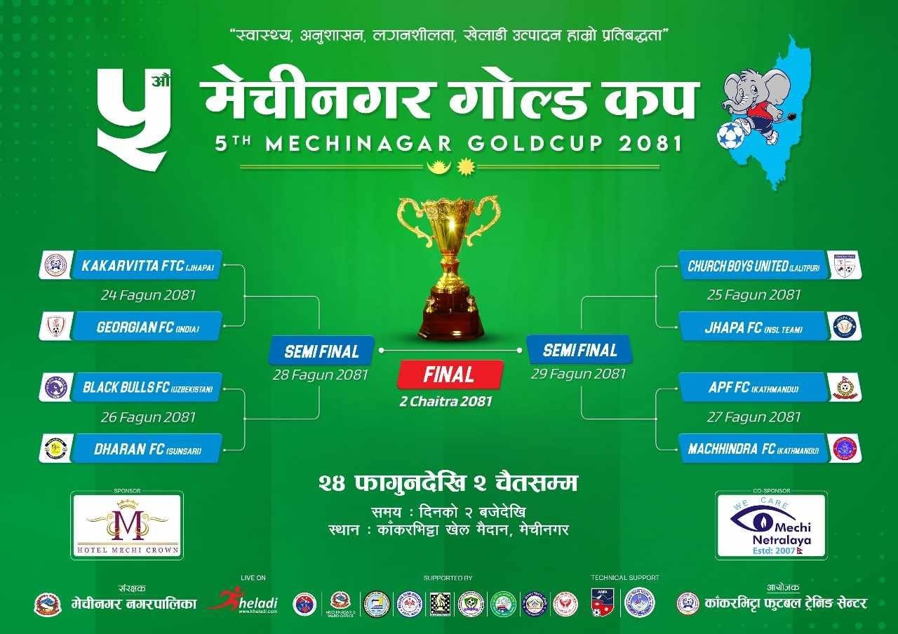 पाँचौं मेचीनगर गोल्डकप अन्तर्राष्ट्रिय आमन्त्रण नकआउट फुटबल प्रतियोगिताको उद्घाटन खेल शनिवार आयोजक काँकरभिट्टा फुटबल ट्रेनिङ सेन्टर र भारतको जर्जियन एफसीबिच हुने भएको छ ।