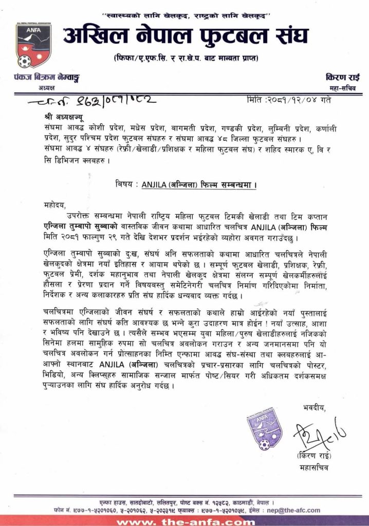 काठमाडौं (हाम्रो खेलकुद)- नेपाली राष्ट्रिय महिला फुटबल टोलीकी कप्तान एवम् गोलकिपर एन्जिला तुम्बापो सुब्बाको वास्तविक जीवन कथामा आधारित फिल्म ‘अञ्जिला’ फिल्म हेर्न अखिल नेपाल फुटबल संघ (एन्फा) ले आफू मातहतका निकायलाई अनुरोध गरेको छ।