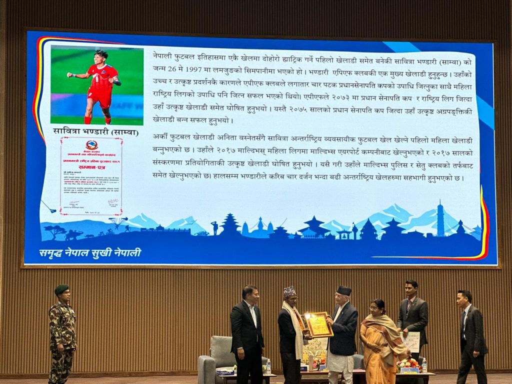 काठमाडौं (हाम्रो खेलकुद) – नेपाली राष्ट्रिय महिला फुटबल टोलीकी फरवार्ड सावित्रा भण्डारी ‘साम्बा’ प्रधानमन्त्री राष्ट्रिय प्रतिभा पुरस्कार-२०८१ बाट पुरस्कृत भएकी छिन् ।