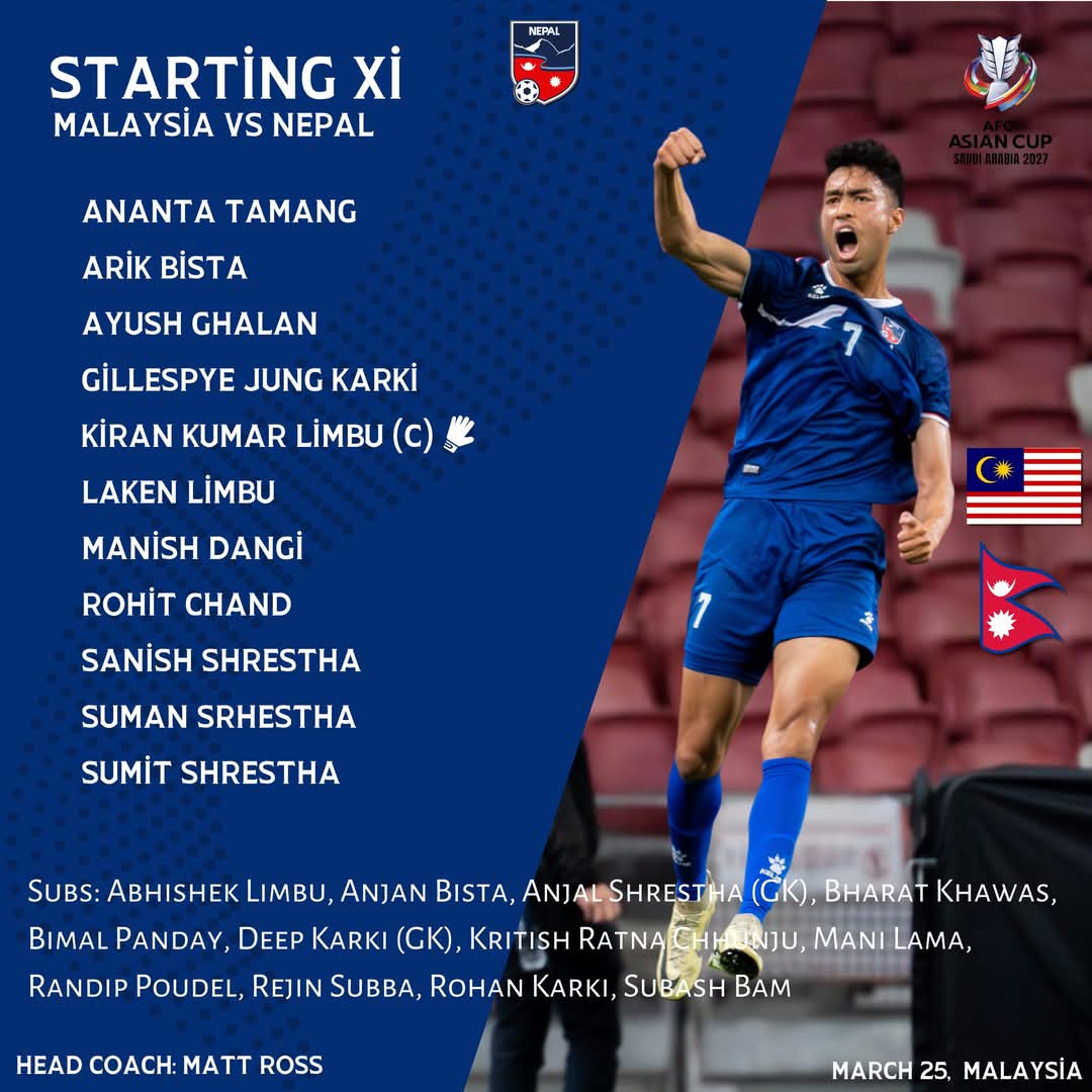 काठमाडौं (हाम्रो खेलकुद)- मलेसियाविरुद्ध आज हुने एएफसी एसियन कप छनोटमा नेपाली राष्ट्रिय फुटबल टोलीमा अघिल्लो खेलको पहिलो रोजाईमा एक खेलाडी परिवर्तन गरिएको छ ।