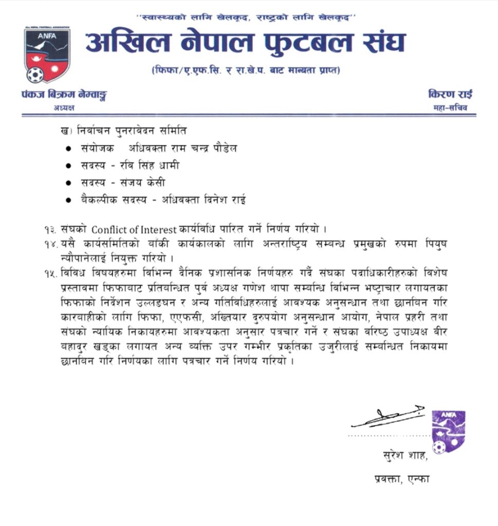 विज्ञप्तिमा भनिएको छ ‘फिफाबाट प्रतिबन्धित पूर्व अध्यक्ष गणेश थापा सम्बन्धि विभिन्न भष्ट्राचार लगायतका फिफाको निर्देशन उल्लङघन र अन्य गतिविधिहरुलाई आवश्यक अनुसन्धान तथा छानविन गरि कारवाहीको लागि फिफा, एएफसी, अख्तियार दुरुपयोग अनुसन्धान आयोग, नेपाल प्रहरी तथा संघको न्यायिक निकायहरुमा आवश्यकता अनुसार पत्रचार गर्ने ।’