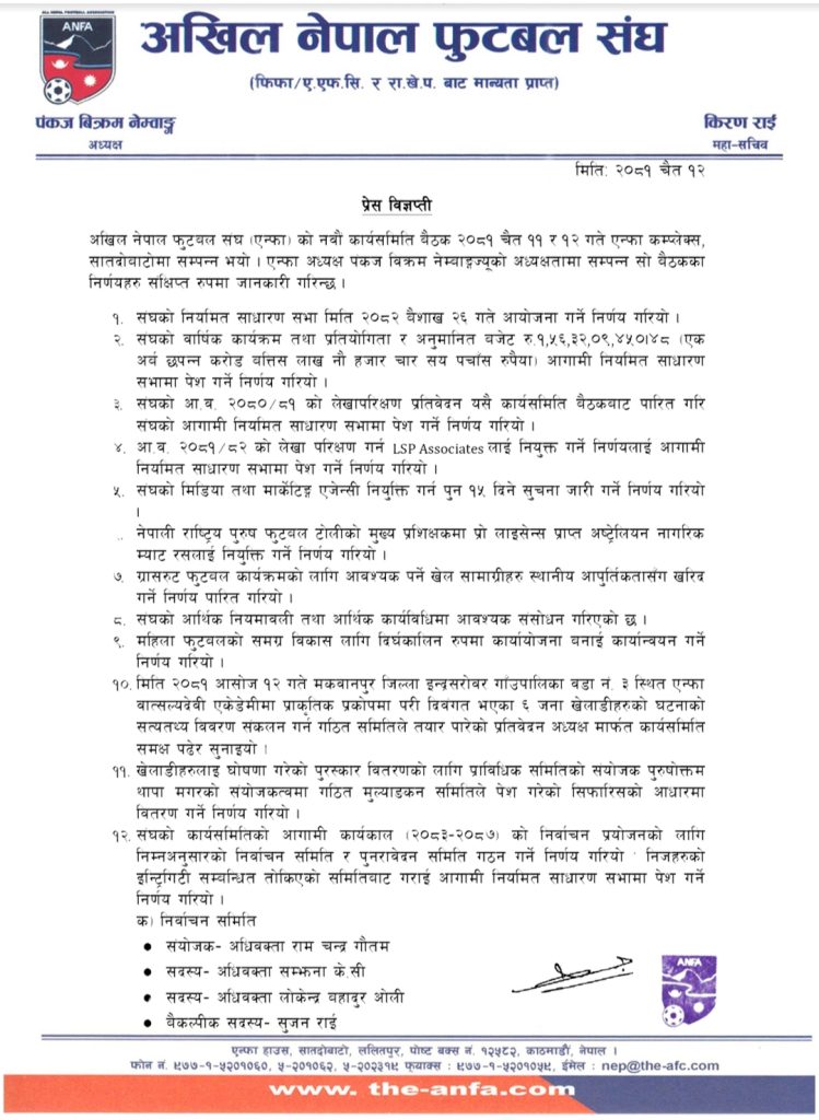दुई दिन सम्म चलेर मंगलवार सकिएको एन्फाको कार्यसमितिको बैठक सो निर्णय गरेको विज्ञप्तिमार्फत जनाएको छ।