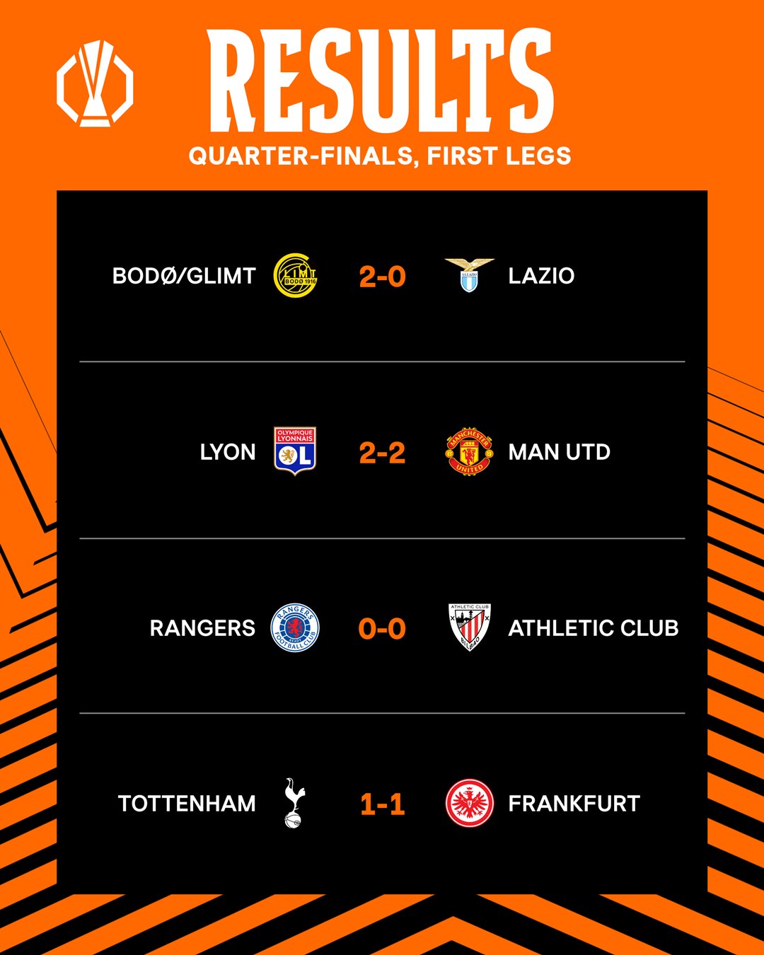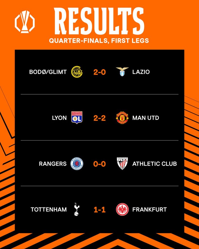 क्वाटरफाइनलको पहिलो लेगमा एफके बोडोले लाजियोलाई २-० ले हरायो भने रेन्जर्स र एथलेटिको क्लब गोलरहित बराबरी खेलेका छन्।