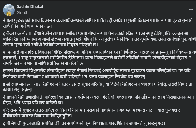 ढकालले आफ्नो स्ट्याटसमा रेफ्रीको स्तर तत्काल सुधार गर्न वा विदेशी रेफ्रीको माग समेत गरेका छन् । उनले रेफ्रीको विवाद असह्य नै हुन थालेको अभिव्यक्ति दिएका छन् ।