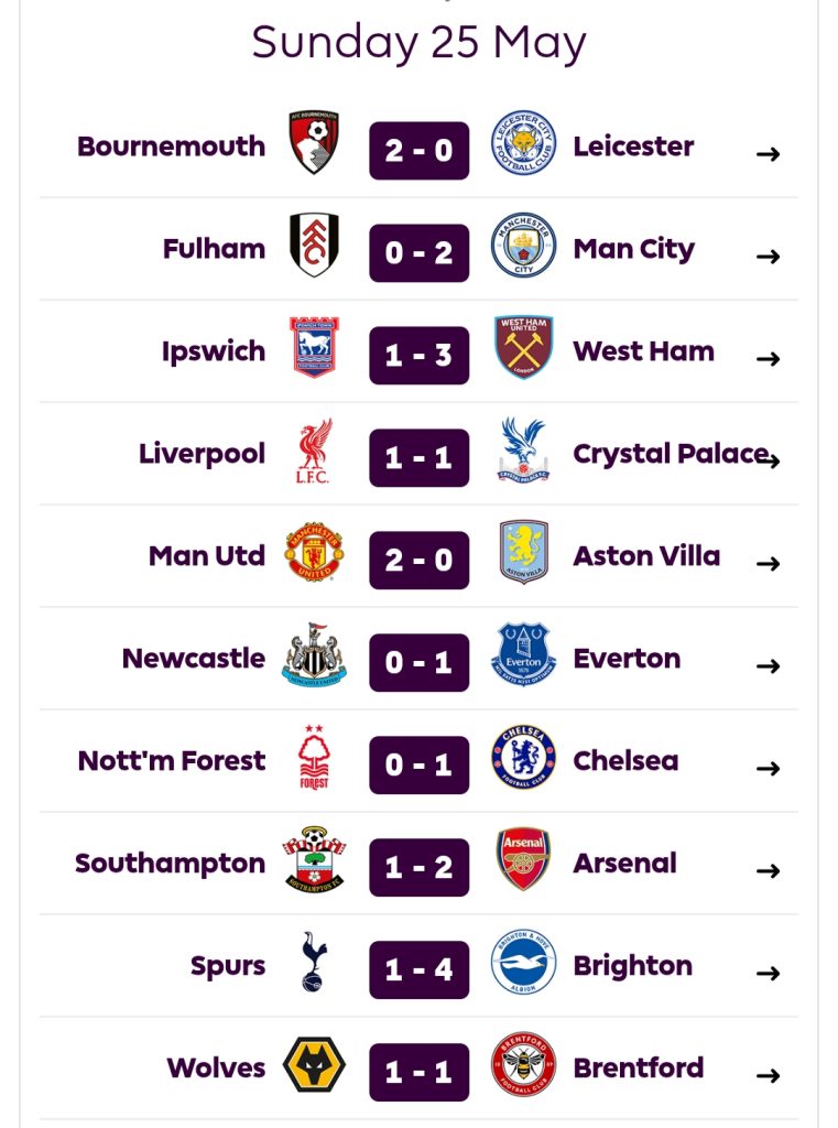 दोस्रो स्थानको आर्सनलले साउथ ह्याम्टनलाई २-१ ले, बोर्नमाउथले लेस्टर सिटीलाई २-० ले,वेस्ट हमले इप्स्विचलाई ३-१ ले, म्यानचेस्टर युनाइटेडले एस्टन भिल्लालाई २-० ले हरायो। उल्भ्स र ब्रेनफोर्डले १-१ को बराबरी खेले।
