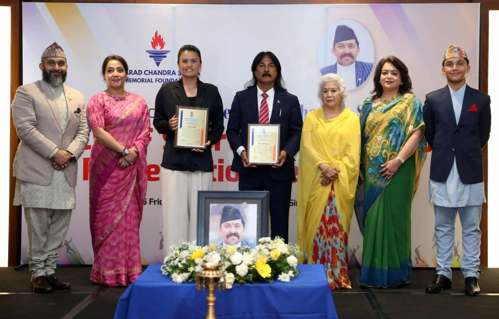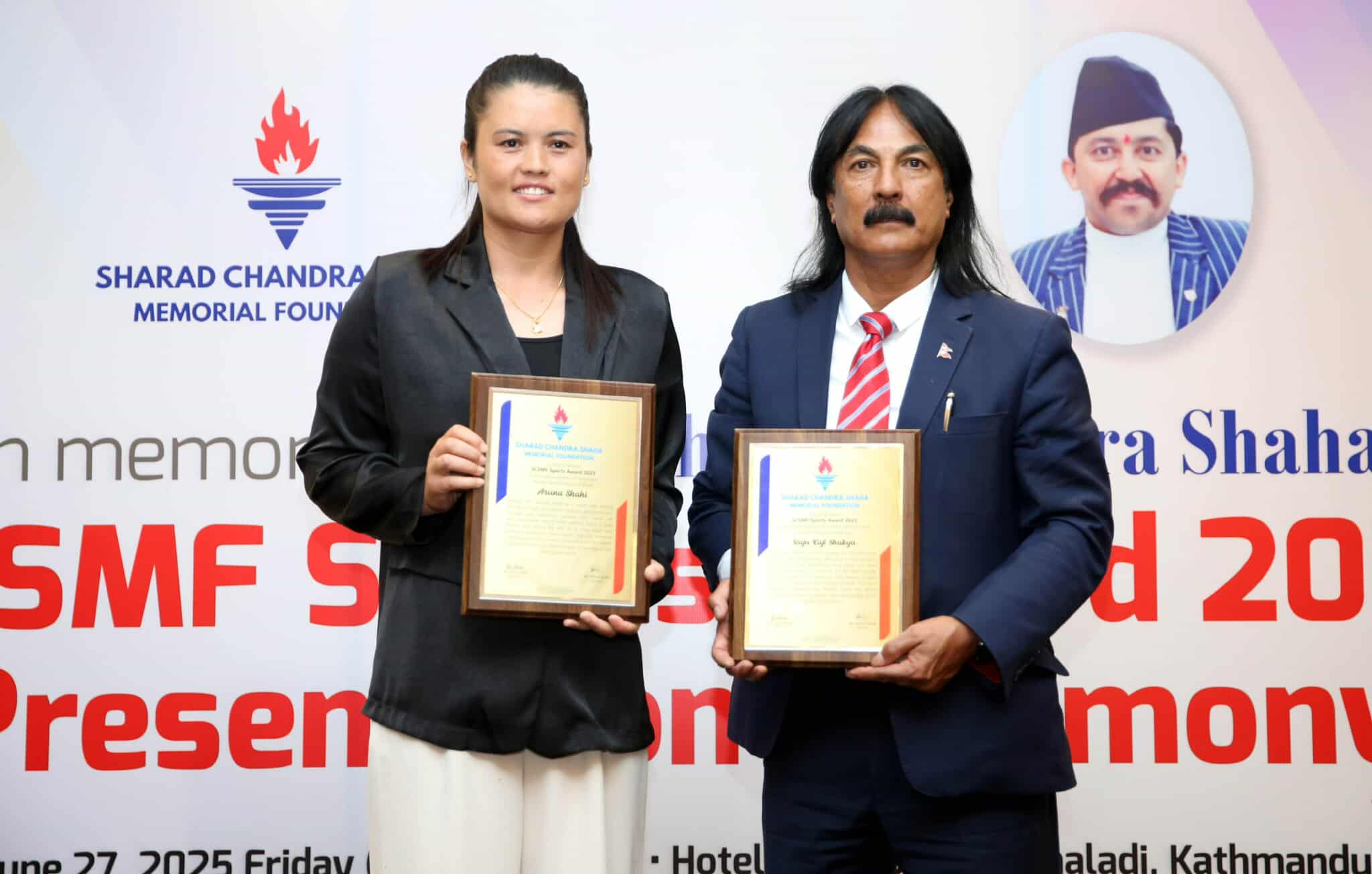 काठमाडौं (हाम्रो खेलकुद)- राष्ट्रिय फुटबल टोलीका पूर्व कप्तान राजु काजी शाक्य र राष्ट्रिय महिला भलिबल टोलीकी कप्तान अरुणा शाही शरद चन्द्र शाह मेमोरियल फाउन्डेसन स्पोर्टस अवार्ड २०२५ बाट सम्मानित भएका छन्।