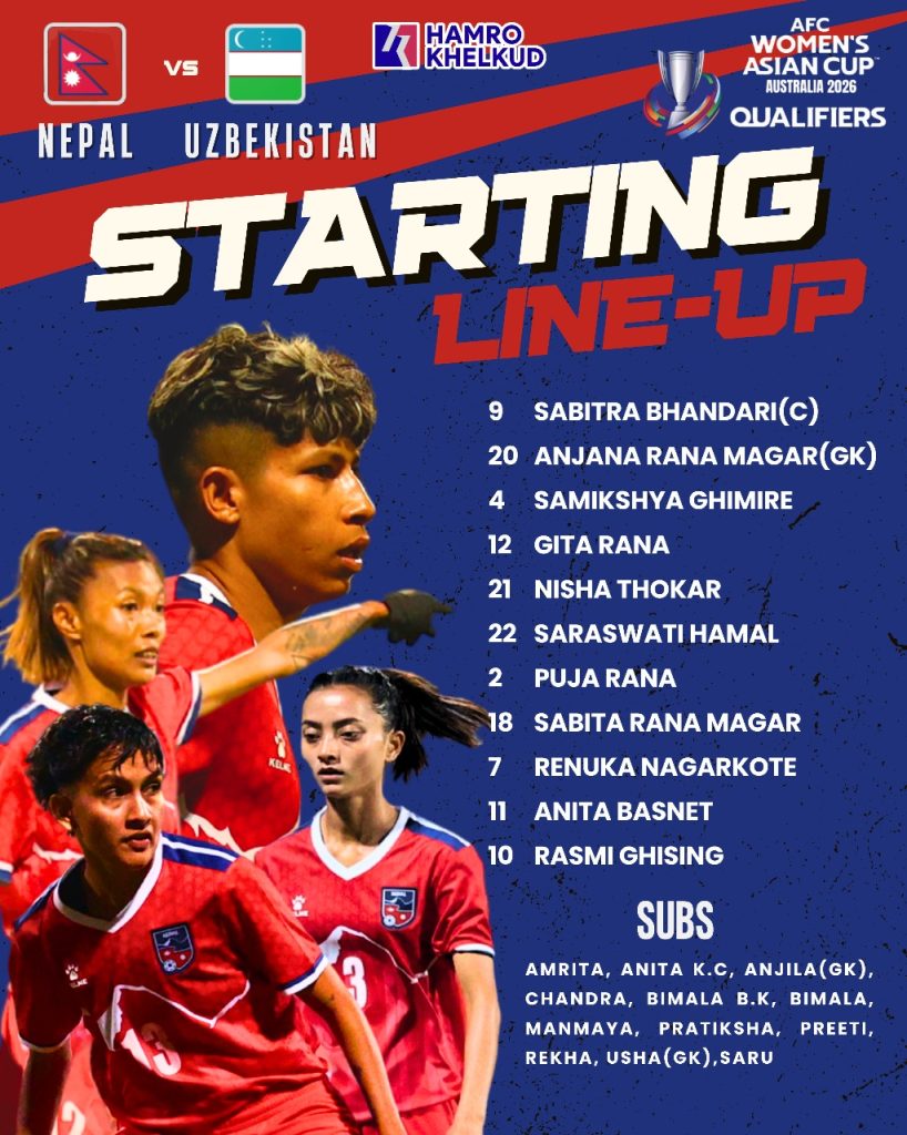 काठमाडौं (हाम्रो खेलकुद)- उज्वेकिस्तानमा जारी एएफसी महिला एसियन कप छनोटको तेस्रो तथा अन्तिम खेलको लागि नेपाली राष्ट्रिय महिला फुटबल टोलीको प्लेइङ ११ सार्वजनिक भएको छ।